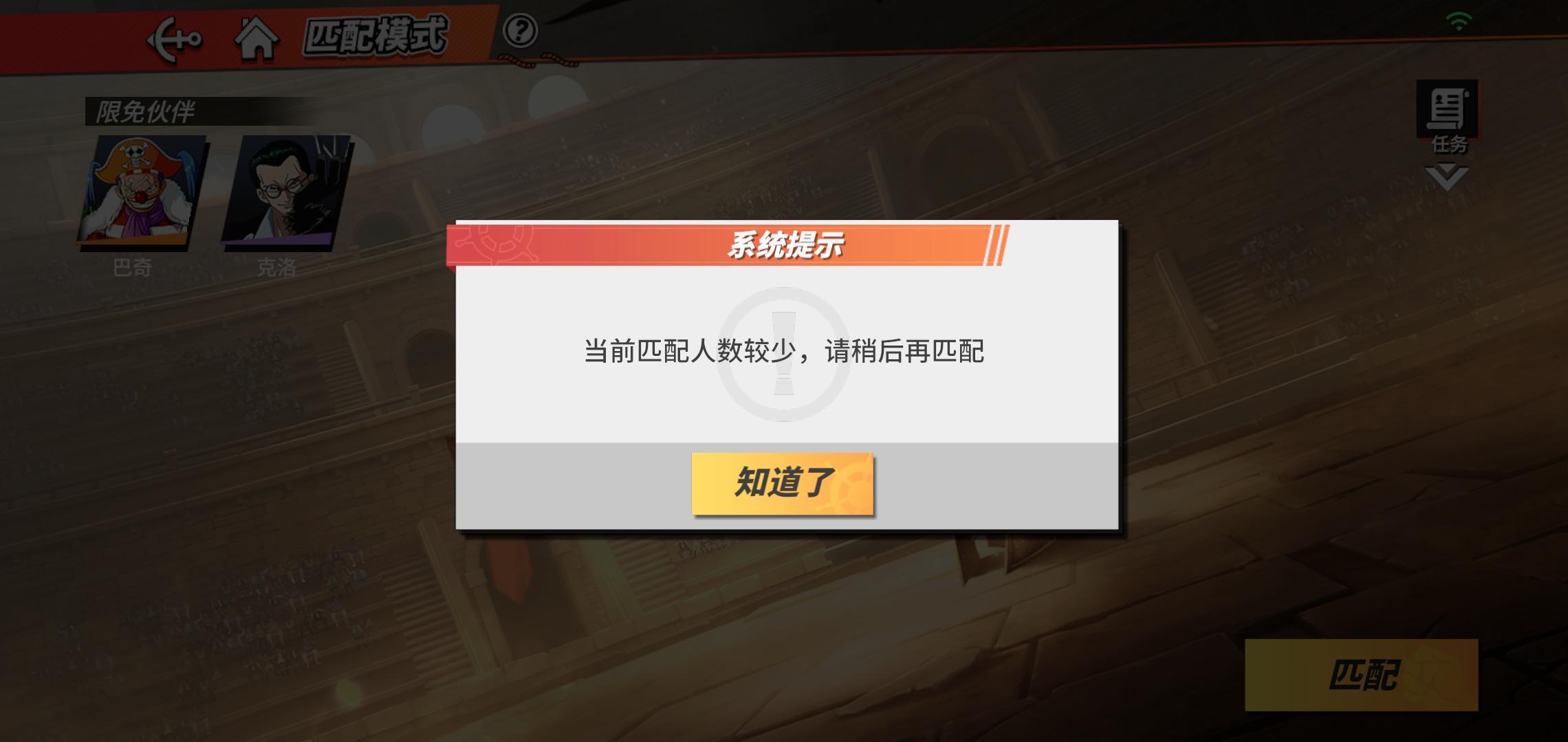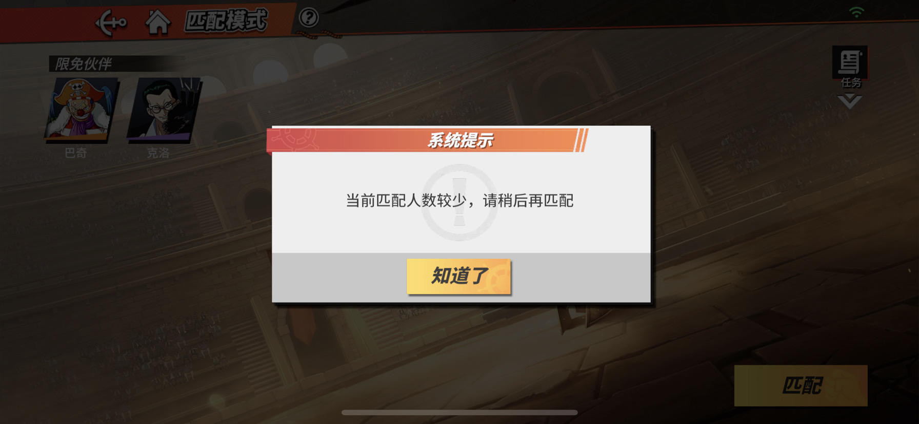 如题,自上次更新后,匹配模式基本匹配不到人了,这是为啥?还是就我自己的坏了?既然匹配不到人,策划能不能给安排点机器人给我做个任务???