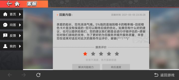 这正常吗!抽人物我全部都是保底送的,连s都是靠保底,抽卡片抽了50多次了,至今一次橙色卡片都没抽到过。不是抽奖池上面写的加保底5%吗?问客服说没有保底,但是你这5%的概率是不是有点问题?。
