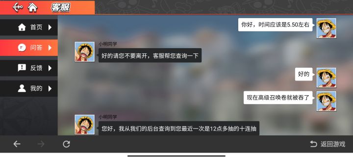 下班后,五点五十分左右,我凑到了第四个10连高级召唤卷,开始抽奖,画好了图,结果乔巴出来说重新连接了,然后连接好,发现10张高级召唤卷没了,看了图鉴和周长里面也没抽过10连的痕迹。问了客服,说没查到这个时间有抽10连。所以,抽奖时千万要保证信号不断。现在等反馈,说是两天时间。非常影响心情。