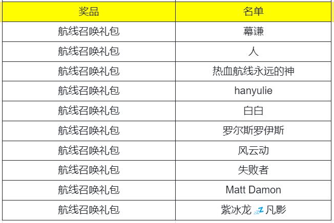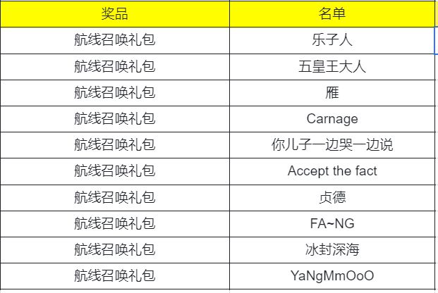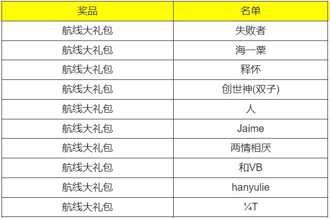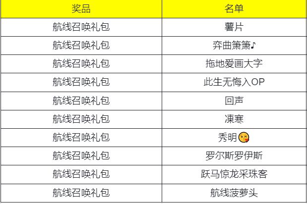 船长们好,开奖时间到啦~ 恭喜以下船长获得活动奖励,请在7天内添加发奖大使QQ (3235248646) 领奖,我们将在30个工作日内发奖(如出现添加一天仍未通过可进入发奖大使QQ空间留言,留言内容:活动名称以及中奖人QQ。)周年庆即将来临,新的旅程即将起航。在过往的冒险航程中,各位船长们曾遇见过什么难忘的事呢?是竞技场中取得连胜,战斗时绝境翻盘,还是在伙伴池中一抽即中,在活动中收获新船只……