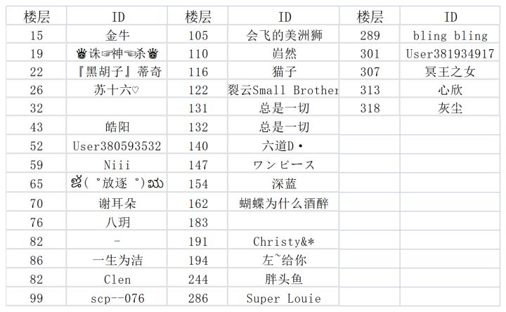 船长们好,开奖时间到啦~ 恭喜以下船长获得活动奖励,请在7天内添加发奖大使QQ (692639596) 领奖,我们将在30个工作日内发奖(如出现添加一天仍未通过可进入发奖大使QQ空间留言,留言内容:活动名称以及中奖人QQ。)各位船长们白色情人节快乐!航线女神表白季,大胆说出来你心爱的航海王女神角色吧!游戏内没有抽到礼盒的船长们快来参与,将有机会获得女神节礼盒!【参与方式】在下方留言,对你喜欢