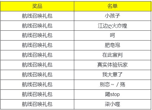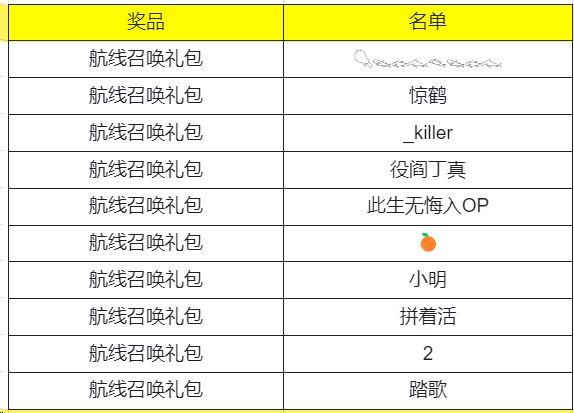 恭喜以下船长获得航线卡片召唤礼包1个,请船长在7个工作日内添加工作人员的QQ2402848532,提供自己回复截图以供核实信息,工作人员会在2个工作日内发送奖品~在航线冒险途中,一个套特别的ID、签名或头像框搭配常常能给别人留下特别的印象!各位船长有哪些酷炫的穿搭?快来回复区分享吧!本周福利升级,参与活动分享,就有机会赢取航线召唤券+卡片召唤券礼包! 活动奖励航线卡片召唤礼包*3