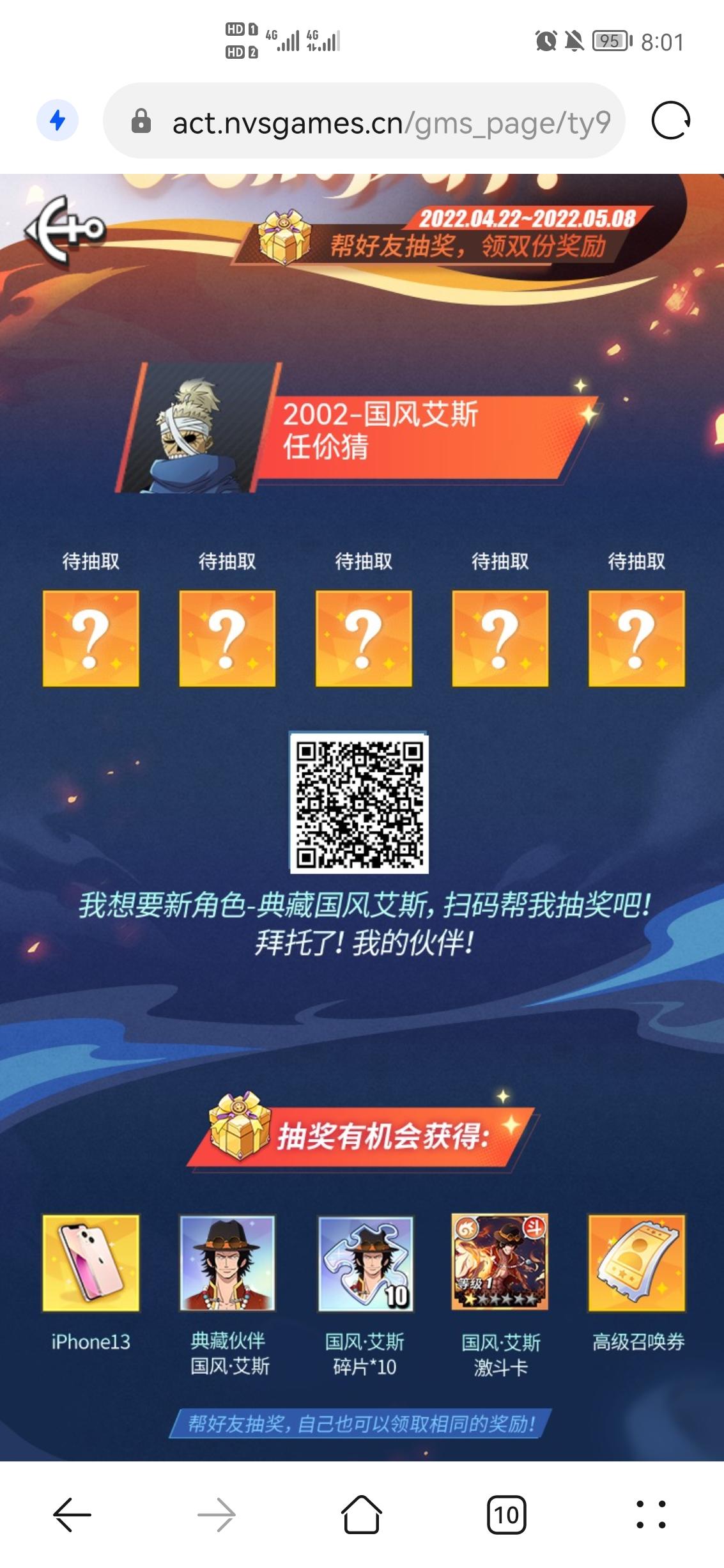 新典藏角色艾斯,参与抽奖奖励成双!点击链接帮我抽奖吧,拜托了!https://act.nvsgames.cn/gms_page/T2B8AE67JX/gms/caca283b69/?tk=ZZZ3JHLQ&orientation=portrait&__gms__platform=mobile