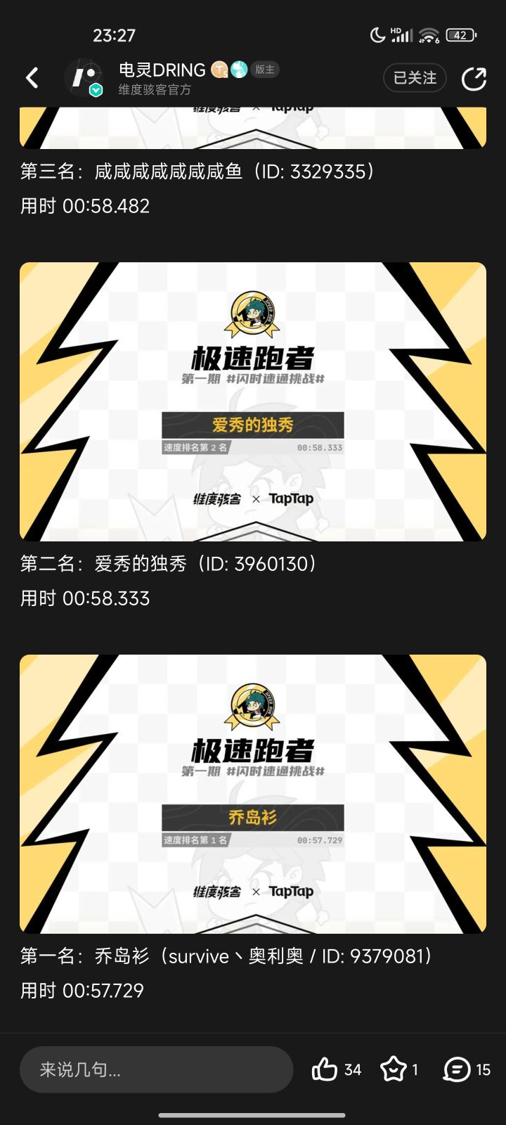 57.552秒前几天打出58后一直在走亲戚今天也是晚上突然想玩了,玩着玩着开窍般的理解了图3那里怎么跳,手感一来打出57了。但还有很多地方可以优化,最近是没空了,我想找个时间(发视频可能是很久之后了,因为真的没时间,也希望各位大佬能和我一起)冲一波56。但我不知道如何去录制,想求助闪时速通时期的大佬,问问他们是怎么录制的,但图4中有两位已经很久没有活动的痕迹,唯一活跃独秀(现在