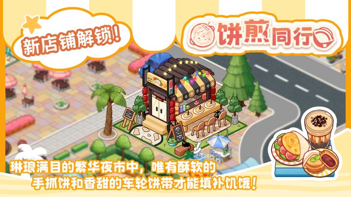 琳琅满目的繁华夜市中,唯有手抓饼才能填补饥饿。不过偶尔也可以换换口味,比如感受一下海鲜馅料的蚵嗲煎和甜蜜满满的车轮饼带来的另一种饱腹感。最后捧着超出名的奶茶,继续在夜市里感受热闹的氛围吧。新款店铺【饼煎同行】现已上架。————————————卡通美食模拟经营类游戏《饮料小镇》已开放下载,欢迎店长们点击下方按钮下载,共建风光秀丽的饮料小镇~