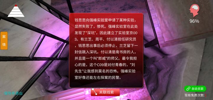 这次都挺好找的 蜡石和火柴可能难一点点位置如下:去三层的话需要锤子1(在地下二层房梁上),木板,长木板合成线索“搭木板”然后上去点撬棍(开紫外灯撬棍周围有线索“灼烧“)。获得撬棍后点一块方形黑色(?)木板上的钉子,屏幕黑后木板倒塌获得锤子2。用锤子2砸掉钢筋即可去三层。(即将通往三层的楼梯上有一个蓝色的线,用紫外灯可以看到,蹲下走过去即可,直接通过会回到初始位置。)其它线索位置可看大佬们的攻