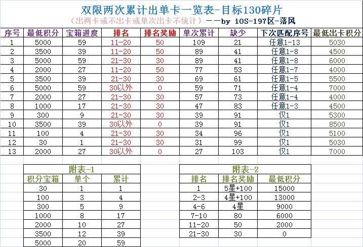 【苹果QQ197区】双限时只拿一张卡的话,分两次拿就行了,不用第一次死怼,太浪费龙石。双限时挺适合低v去拿,当然也要结合自己阵容去选择哪张卡更合适。个人比较推荐的是第一次5000分拿奖励碎片,第二次拿前三十名。当然也要结合自己所在区的以往限时分数去参考。具体可参见鄙人原创的下图。祝大家新年快乐,游戏愉快!