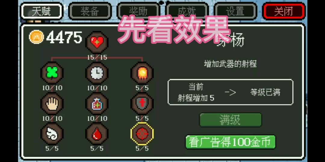 相信大家下载游戏后都发现了游戏是没有新手引导的,那我就做一个伪新手引导吧①首先是头像是可以点开的,点开后就是升天赋的界面,随时都可以点开呦②寒霜杖可以将怪物冻住,冻住后你对怪物施加的攻击会叠加,指的是击退效果,解冻之后击退效果会一瞬间释放③上图的装备介绍写的是武器的初始属性,即没有叠加任何天赋④设置中可以重来,相当于自杀,不会对游戏数据造成影响⑤轻盈千万不要点太多了,否则你操作起来会非常