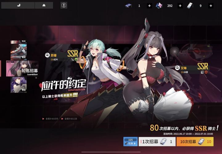 亲爱的指挥官:今日已完成更新维护,内容如下:维护补偿:意识*100+量子结晶*700+骑士招募许可*10问题修复补偿:量子结晶*500总计:意识*100+量子结晶*700+骑士招募许可*10以上奖励已发送到游戏内邮箱,请指挥官们上线领取01.「应许的约定」轮巡招募卡池开启活动时间:6月17日10:00~7月1日10:00活动内容:本期轮巡招募限时概率UP骑士为「苏珊」和「艾琳」。0