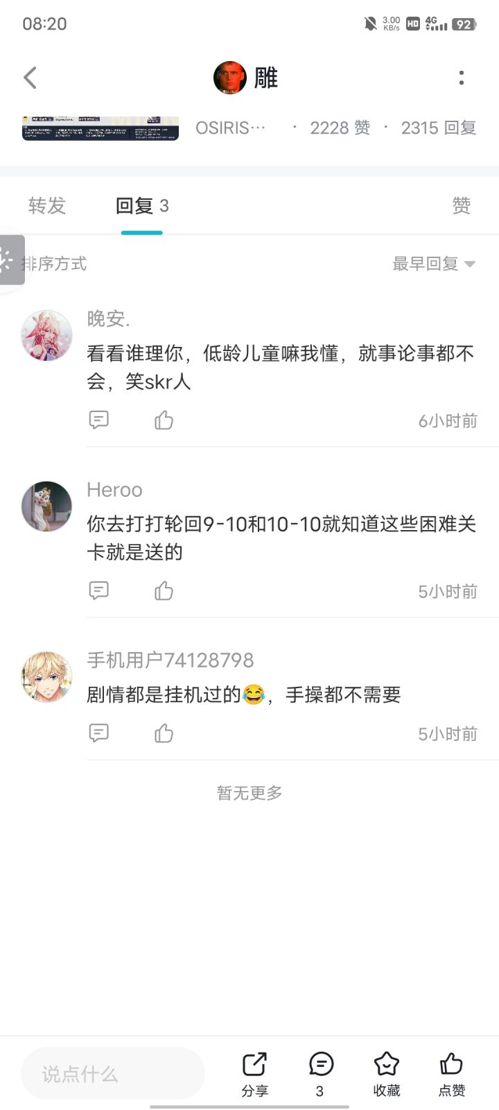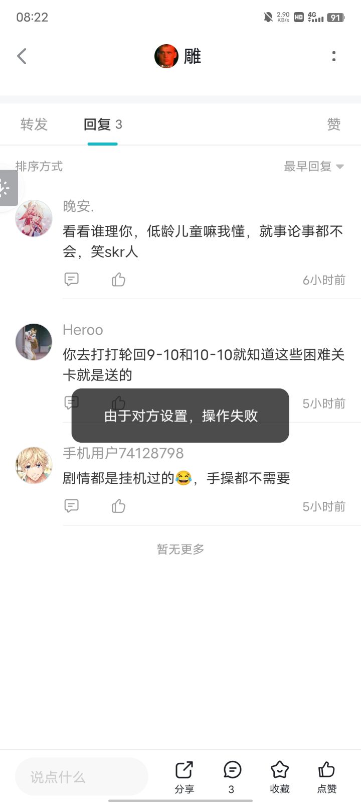 事情原委:我骂那个洗地的是罕见,这名叫晚安“正义使者”光速对我ttk,跑到我几天前发的帖子阴阳我,但当我想反击的时候,已经发现已经被拉黑了,这难道就是传说中的韩国精神胜利法嘛😑。额,不是咱就是说哪有骂一句就拉黑这种低能操作的😢。