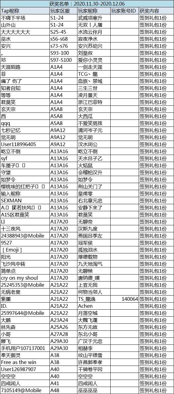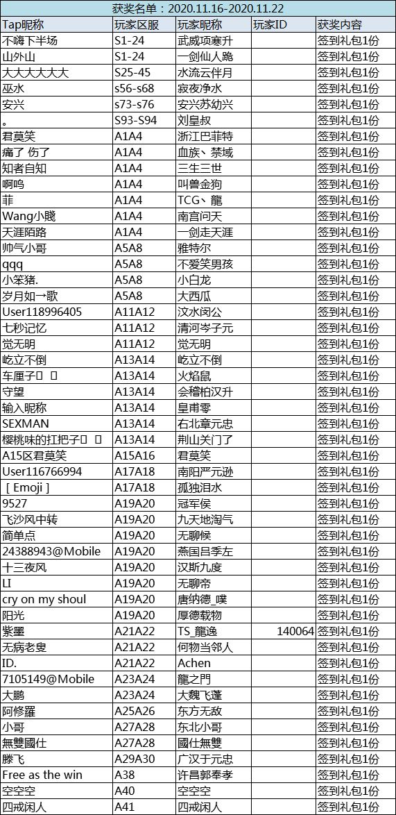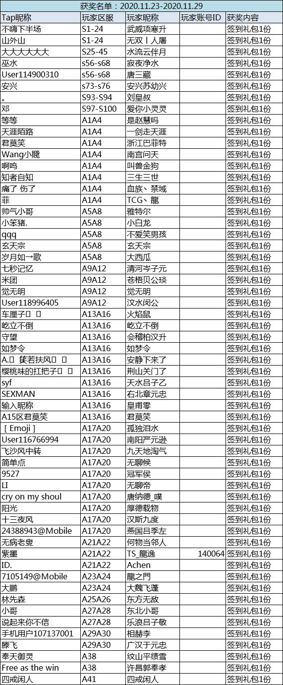 恭喜以下主公在本周的签到活动中获奖,奖励将在1-3个工作日内,通过签到预留的信息,发送至您的游戏内角色下邮箱内,还请留意查收!签到详细情况公示,部分主公因为未能签到满4日,很遗憾的未能获得奖励,下次继续加油哟~老规矩,签到打卡皆有机会获奖~只要在本周内累积签到4日,即可领走大礼包一份;还在等什么赶紧行动起来吧~Ps:所有区服,所有渠道玩家均可参与其中~【签到规则】≯每人单独占1个楼层