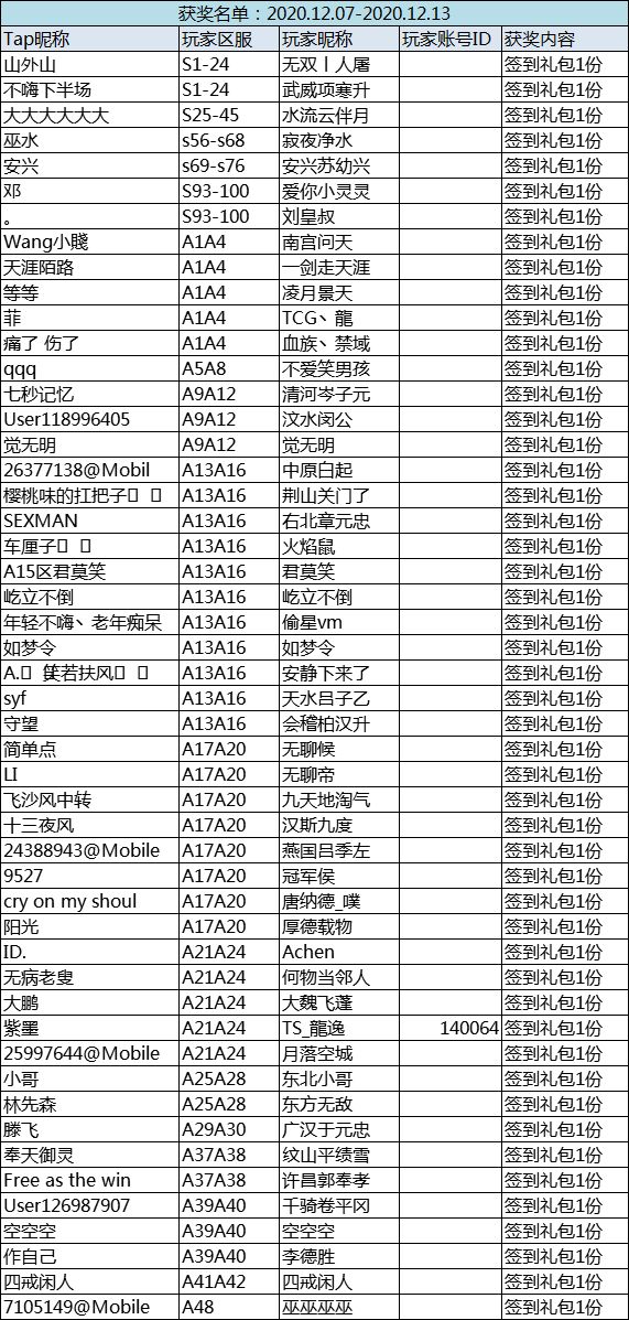 恭喜以下主公,在本次签到活动中获奖,奖励将在3个工作日内,通过游戏内邮件的方式发送至您的角色信息下,还请注意查收!签到详细情况公示,部分主公因为未能签到满4日,很遗憾的未能获得奖励,下次继续加油哟~---以下为活动内容---老规矩,签到打卡皆有机会获奖~只要在本周内累积签到4日,即可领走大礼包一份;还在等什么赶紧行动起来吧~Ps:所有区服,所有渠道玩家均可参与其中~【签到规则】≯每