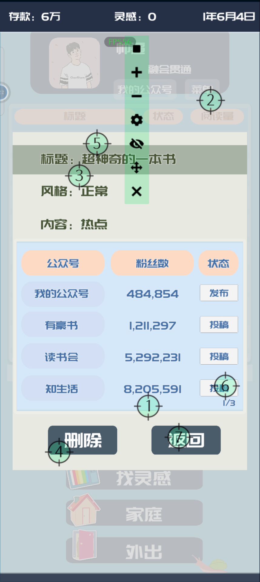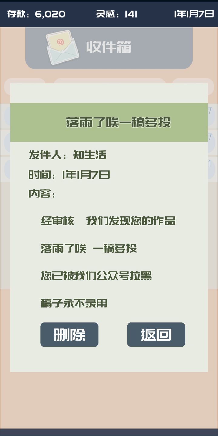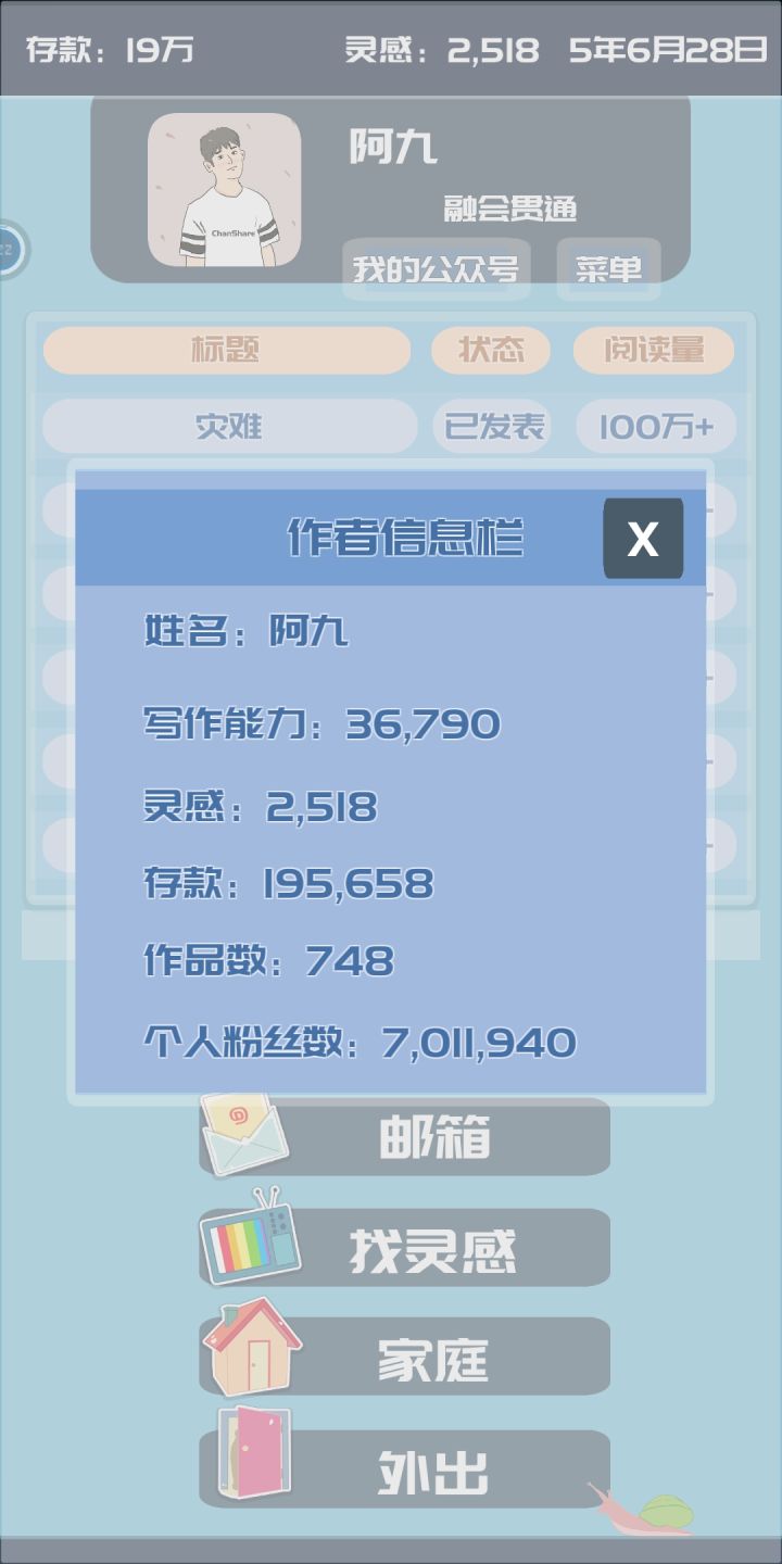 浅写一下攻略吧前前后后花了几个小时,刷了三年投稿建议一个等级一个等级来,平常可以多升一升学习,提升写作能力前期可以先买股票,够钱了再买单身公寓什么的最后一个杂志社大概需要五千多的灵感,每次最高也就四五万块钱,所以后期可以去道具里面买公众号助理,增加公众号粉丝,最高每次是五十万的报酬,这样就不愁钱了宠物可以先买小金鱼,建议后期有点钱直接买神兽,因为神兽不会死,每次可以获得6800的灵感