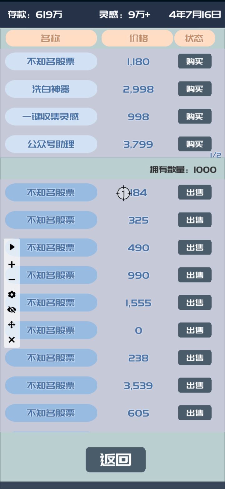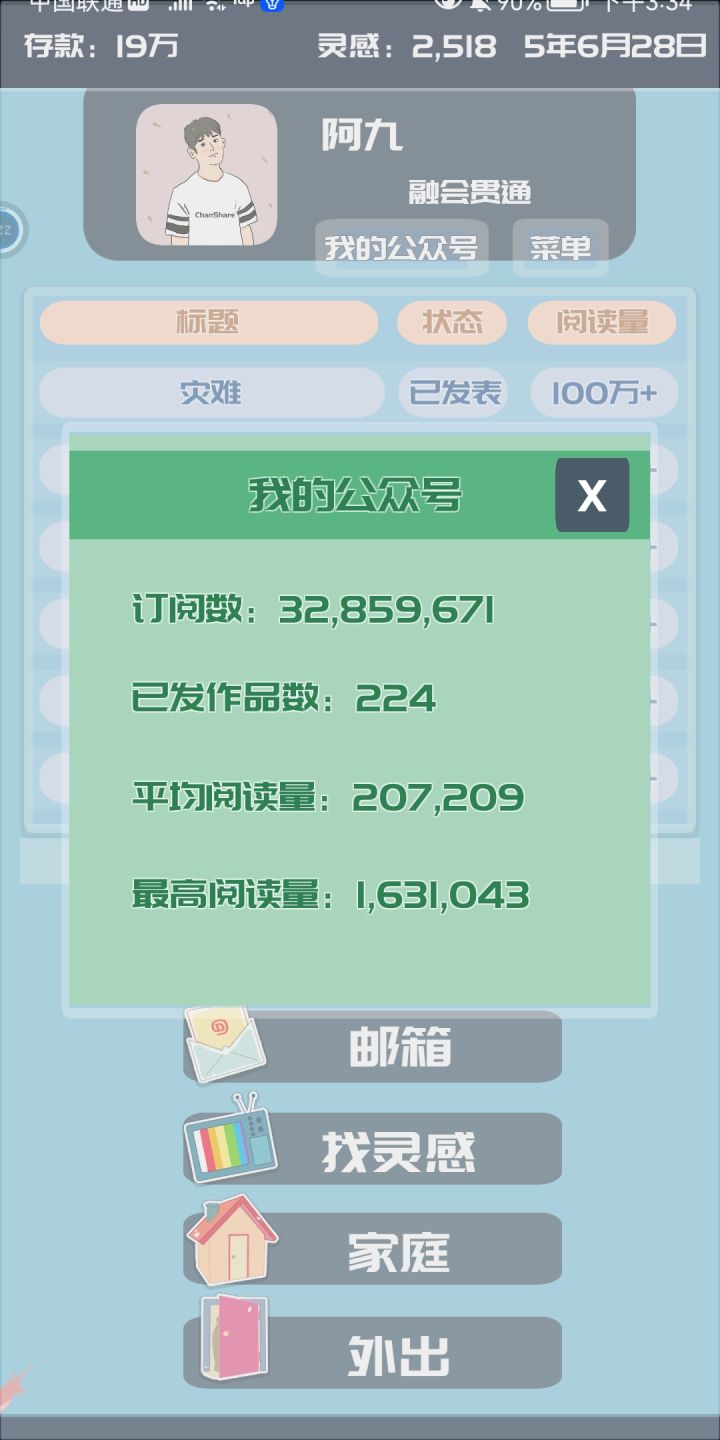 通关了,刚开始不会玩,一直审核没通过,还耗费每次一百灵感,写作能力上来后,才发现只需要30左右的灵感就可以发在第一个公众号里。省吃俭用,买了神兽,超值,寿命900+天。中间知道自己的公众号比其他平台更能赚钱(0灵感都能赚钱,这太好赚钱了),一直在买公众号助理,后面边等6800灵感,边刷写作能力。到后期,才知道原来标签点三次,能一次等三份的钱,恨不早知道这个。公众号广告费最高只到50w,后面仅用2000灵感轻轻松松得50w,已经算是通关了,因为神兽买了七个,一次得6800,发在公众号里简直是捡钱,再玩下去没必要。买完房子,直接休息。