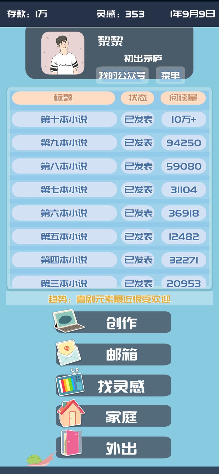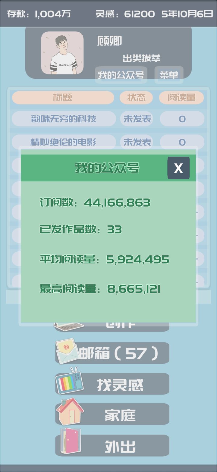 灵感前期肝一下就行了,后期买神兽就没有问题了。写作能力开始我是觉得非常难得,然后我发现可以通过买房子来获得。除了出租房,其他的房子买了过段时间之后就可以买房子来赚钱,非常方便。新人前期可以买股票,股票越多越好,然后花点时间,把价格高的股票卖出去。然后在买新的股票,我是买了一百个股票,然后隔天就卖一次。我一直在给公众号买粉丝,前期不需要买粉丝,后期去道具那里直接买公众号助理一直刷。最后等写作