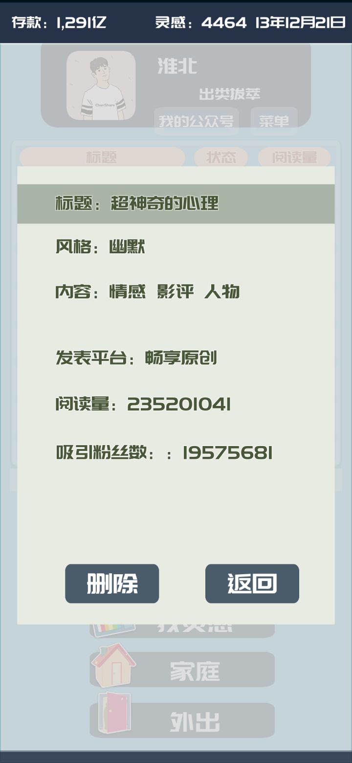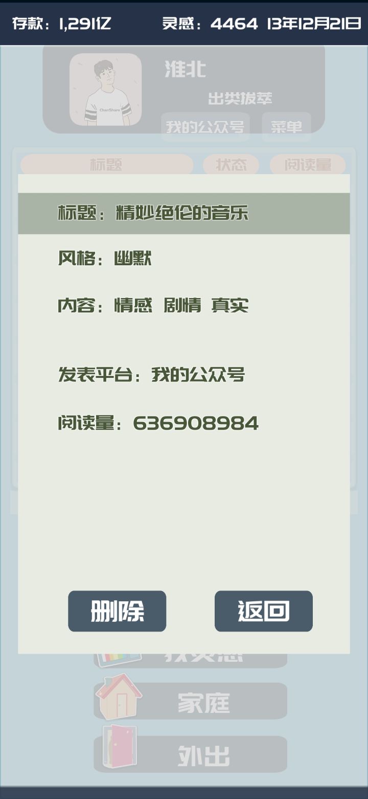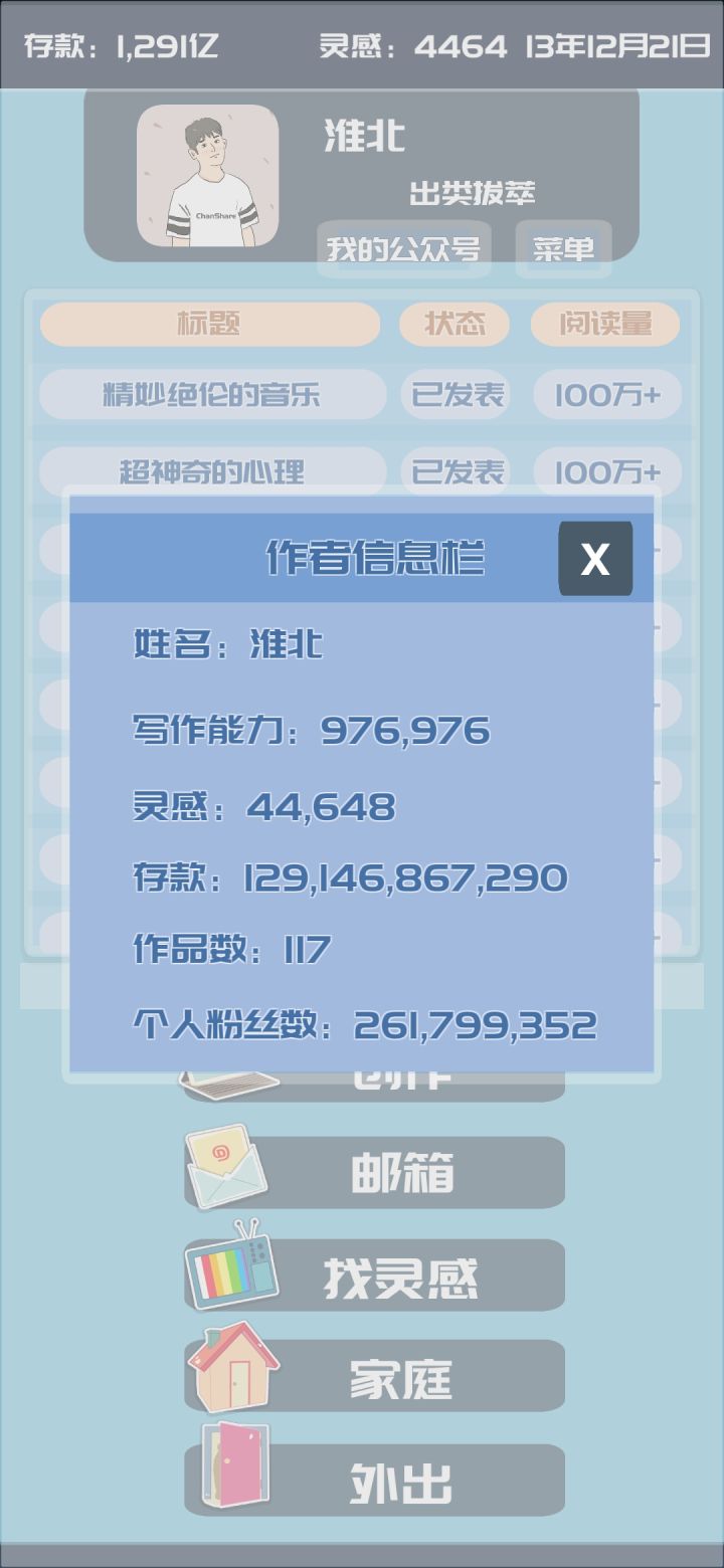 我感觉玩到后期就很无聊了,建议添加些别的功能,比如回家,在比如谈恋爱,比如同学会,比如作品获奖,去参加颁奖典礼,比如有所成后过年回老家打哥哥脸…… 这游戏进步空间很大,希望不久后能看到全新的你