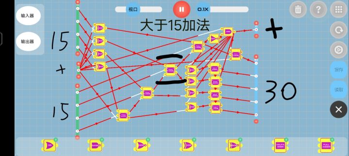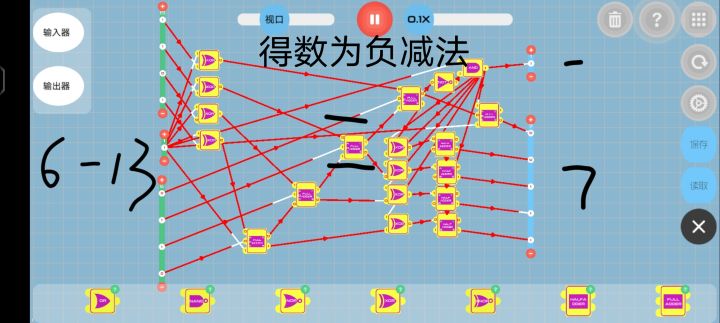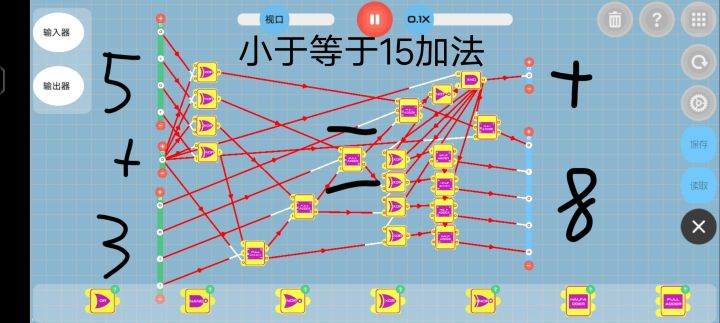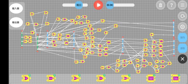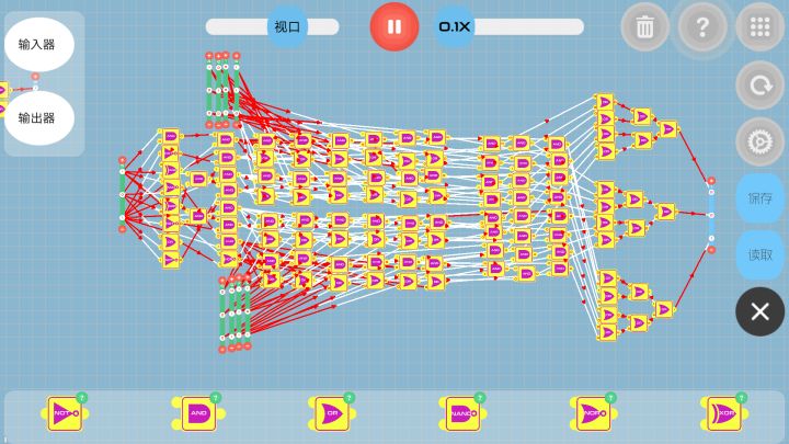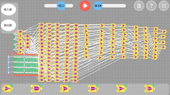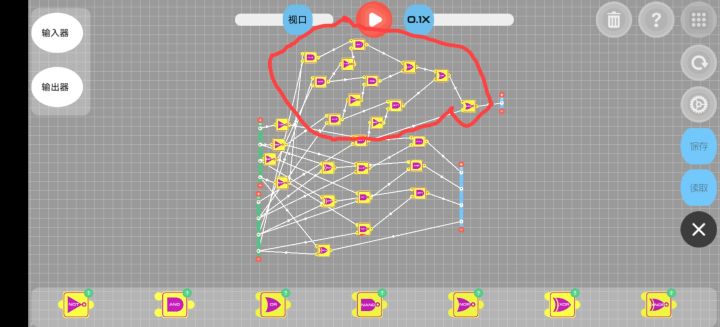 判断部分:获取第一列输出1的and对应的输入器的数值。(我的想法是当任何一个第一列and输出为0时,该项结果为0,任何and输出为1时,该项与原数相同,总结为and门)所以可以将第一列and的结果与对应输入器的每一项形成and门,方便观看,我这是每项为一列and(如图中间16*4个and门)