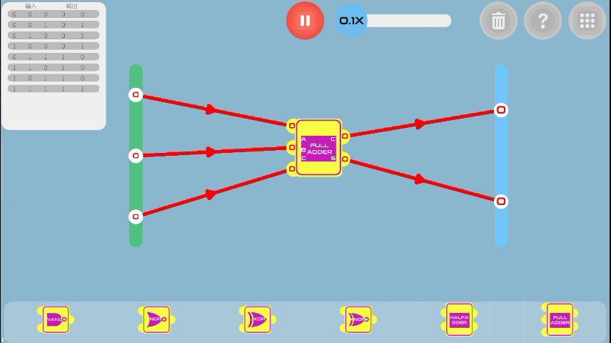 个人觉得游戏做的很好,能学到一些东西(例如自己做计算器)留一张通关图片关于游戏的建议吧,首先加一个控制震动的开关,另外感觉自由搭建里面东西太少了,比如关卡里面那种二进制和十进制转化,还有长条那种输入信号的,这样自己做点东西也方便。最后催更第五章,作者加油