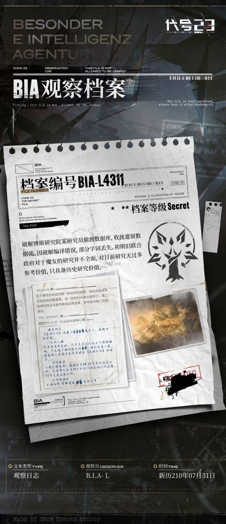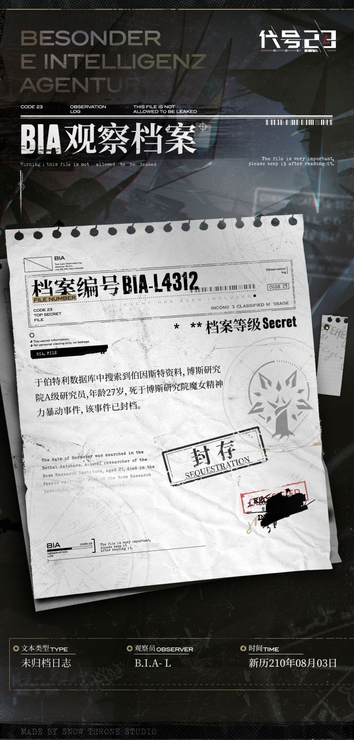 档案编号 BIA-L4311档案等级 Secret事件已收录 >>往期魔女研究遗留数据破解------------------=================「档案回顾」