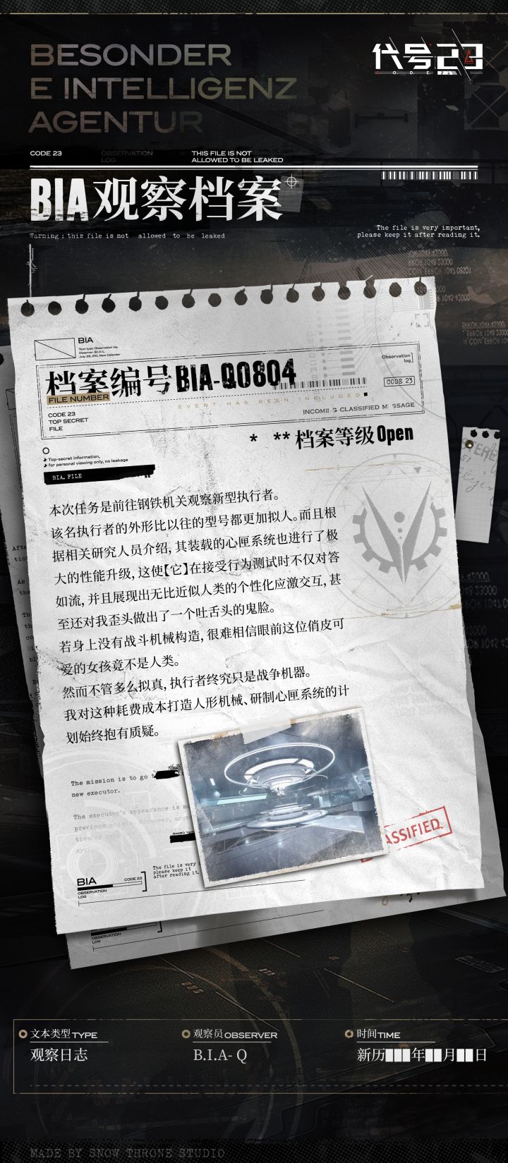 档案编号 BIA-Q0804档案等级 Open事件已收录 >>钢铁机关新型执行者------------------=================「档案回顾」