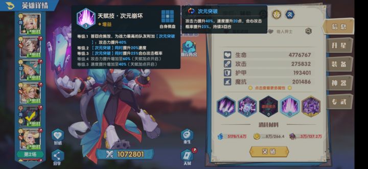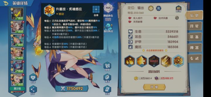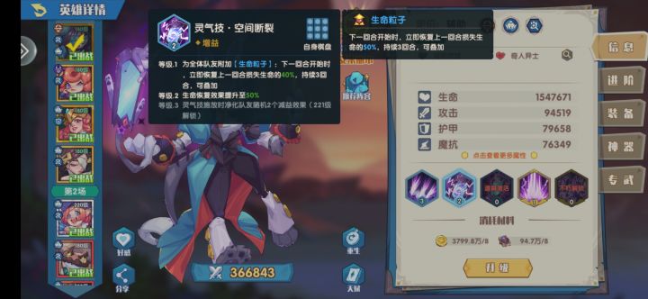 话不多说直入正题,本期为大家带来次元魔导艾米丽儿的技能分析,就业思路,育成时点以及前景展望。Section1:技能分析。略过平平无奇的平A,镜头首先给到灵气技·空间断裂:持续三回合的回溯性技能,每回合恢复上一回合损失生命的40%。2级恢复50%。3级在释放时清除队友两个debuff。一眼强,但是实际上没那么强的技能,续航能力非常强大,配合回蓝或者多重施法可以保证血条永远是满的,不过目前游戏环境