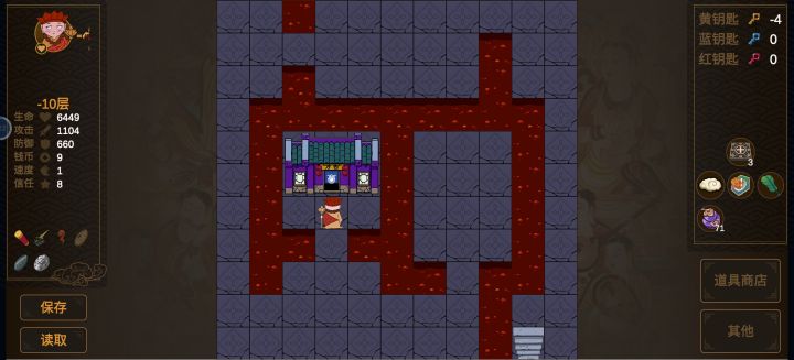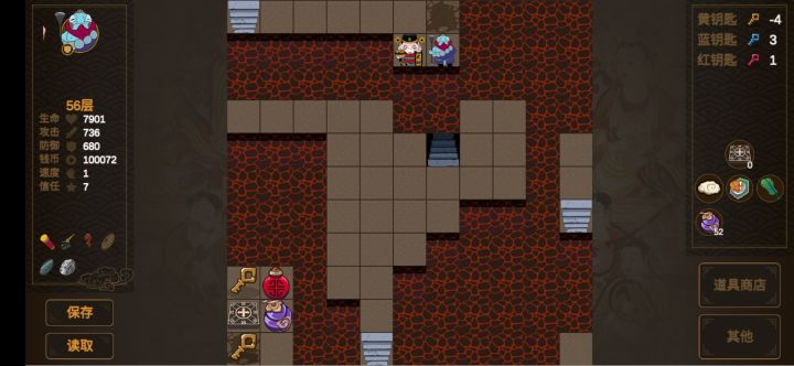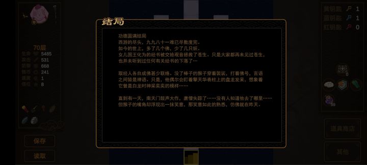 终于通关了,三个结局都打了,钥匙是感觉严重不足,所以在用之前考虑门后面值不值得开,先以爬楼为主,最后有多余的钥匙再开剩下的门。留意有很多暗门,对应坐标大神已经发出来了,对游戏通关有很大帮助。1~8层的东西几乎要捡完才能打赢8层商店门口的老虎,还要考虑捡东西和开门的先后顺序,所以个人感觉8层前比后面还有挑战性一点。8层后就是无脑堆防了,20层前把攻升140+不然石狮子过不去,其他根据地图怪的攻击升防