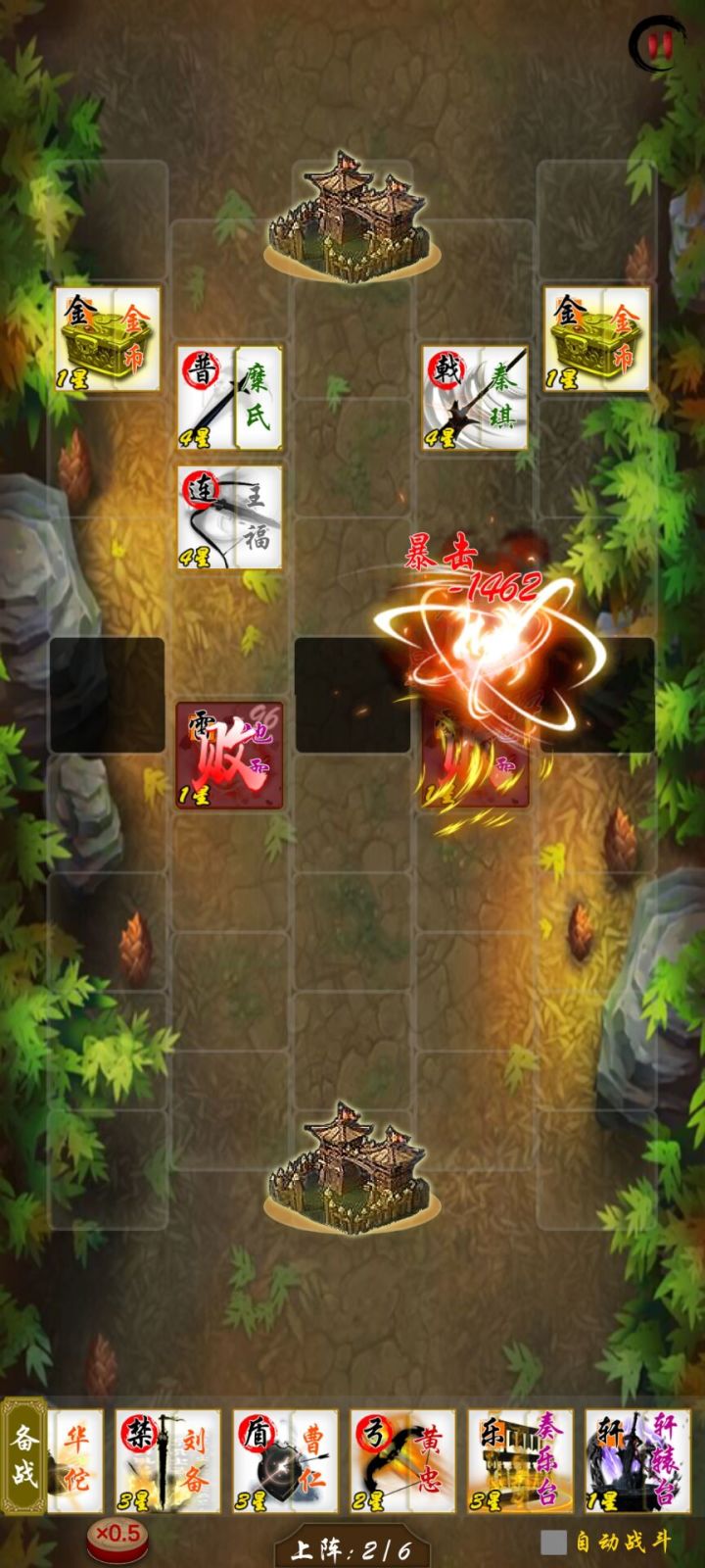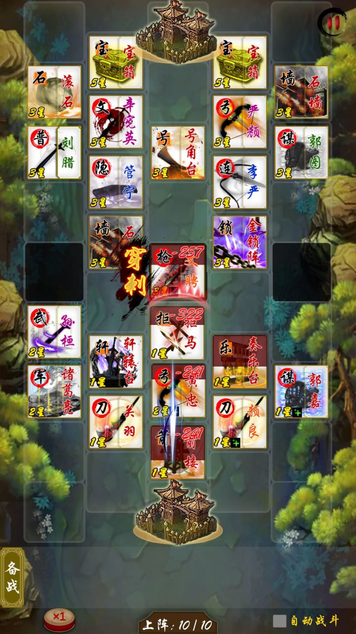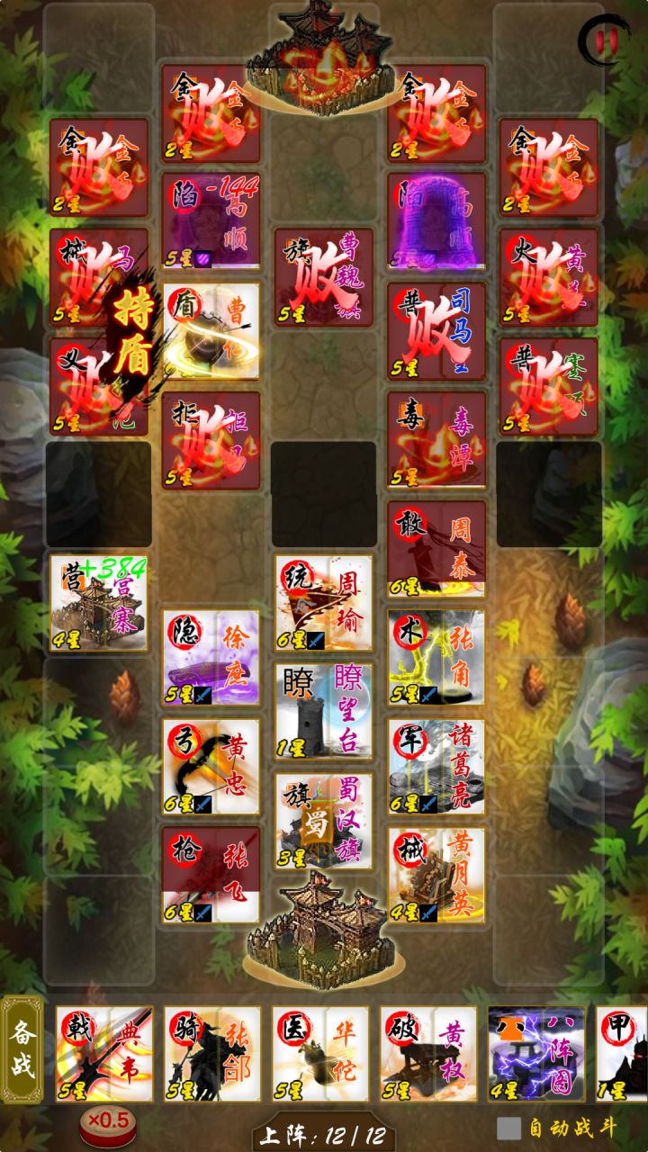 此关在于电脑两个迷雾阵加上了周围闪避效果,所以得用张飞,典韦等aoe近战武将迅速击倒迷雾,新手可用张角,滚石,滚木等增加对面晕眩几率