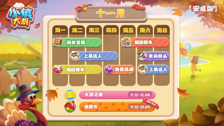 北风裹挟着阵阵凉意,小镇里也点燃了温暖的篝火🔥厨厨在这里邀请所有可爱的大厨们前来品尝我们温馨的感恩节大餐【开启时间】:2022年11月12日~2022年12月4日【活动玩法】:通关获得骰子→投掷骰子→根据投掷的点数移动步数,获得奖励【活动餐厅一览】感恩节的标志性食物是什么?——当然是鲜嫩多汁的烤火鸡呀!边吃边来点脆口小苹果🍎和鲜甜绿葡萄,腻了还可以蘸着特制🍒梅子酱吃,美滋滋什么什么,