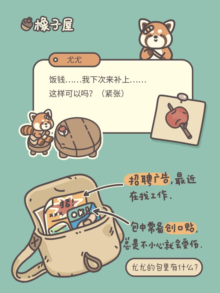 大家好,这是游戏里第一次来吃饭就丢了钱包只能赊账的尤尤!大家对Ta却很包容,甚至想雇Ta在橡子屋打工!悄悄透露,其实制作组本来确实有这个想法,还给Ta画了打工服,但是后来鸭皮说,人家有自己的生活,哈哈哈哈!希望大家都天天开心#橡子屋 #游戏推荐 #游戏安利 #游戏福利 #游戏讨论