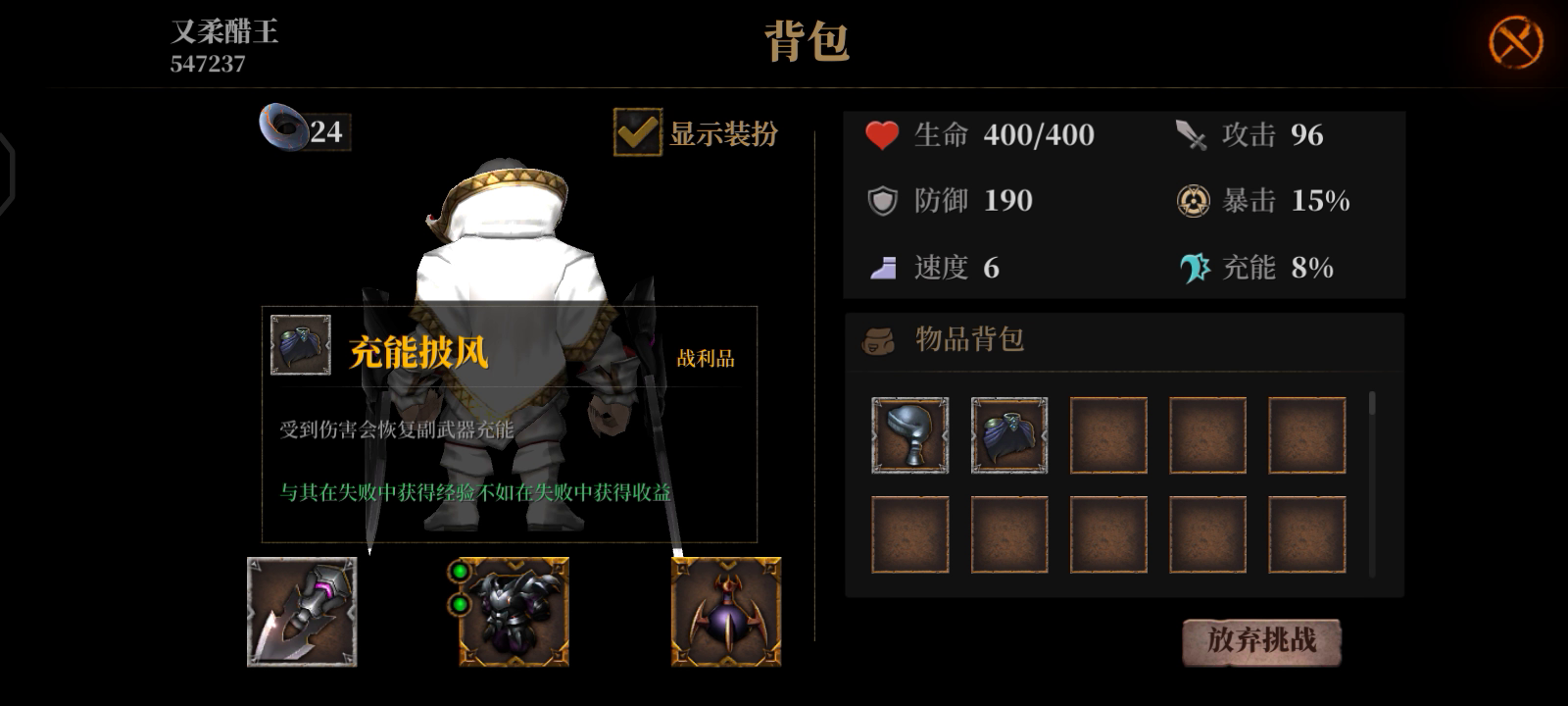 皮肤国王,独角护甲,附魔+100%宠物伤害,附魔大嘴幼宠物。 武器喜欢打人的带个麒麟双刺,喜欢挂机让宠物打的,带个大锤大剑这种攻击高的,副武器带龙蛋,一路a过去就完事了。 这套的思路就在于护甲增加一个宠物,那你就有两个大嘴,吃200金币就给两个战利品,在搭配皮肤会刷纯金怪,一趟刷完最少都是几十个战利品,战争金币基本上百分之百能拿到,感觉用不上的战利品就卖掉换金币。搭配各种战利品攻击力很高,麒麟双刺的高攻速加上各种攻击特效的战利品,这游戏就跟割草一样简单。