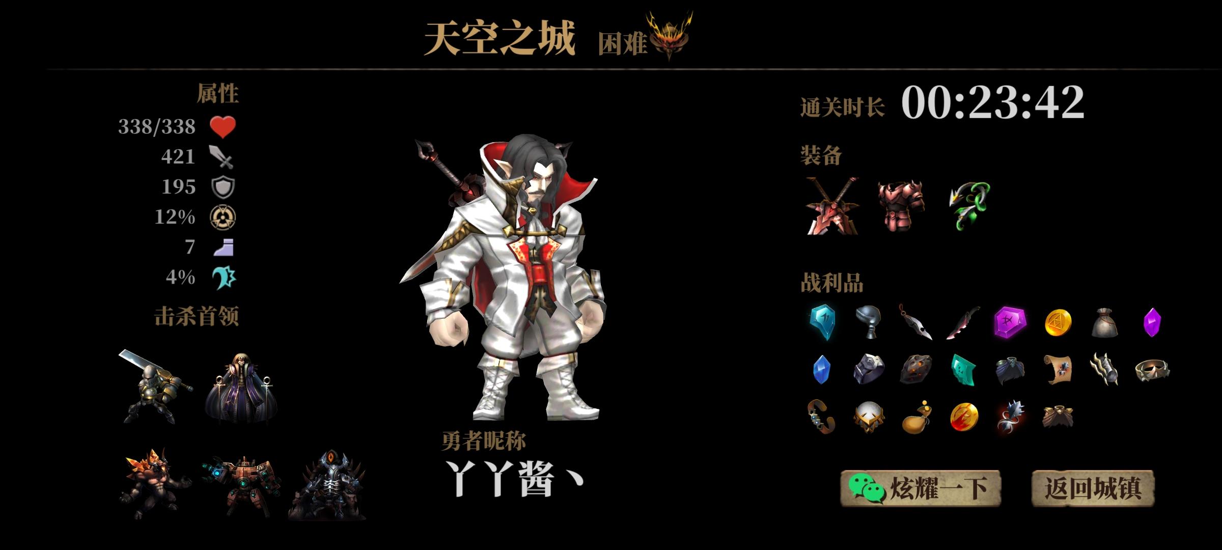 是恶魔皮肤翅膀不帅还是漆黑不强?没刷金币没卡奖励正常打(不过这把运气好,开局诅咒刀+武器强化+1战利品)困难基本没肉都是商店买的,带个龟壳捡到狂战士就压血没捡到就算,运气不好5-6百攻击吧不挑武器,版本答案(武器技术不好的没有龟壳的尽量别用诅咒刀,有盾也扛不住而且困难基本不出肉,盾也不够受到伤害双倍会暴毙),碰到狂战士和半血大剑压半血也很厉害!猥琐点的用十字弩镶嵌力量齿轮和狂战士都可以,能玩的太多了…