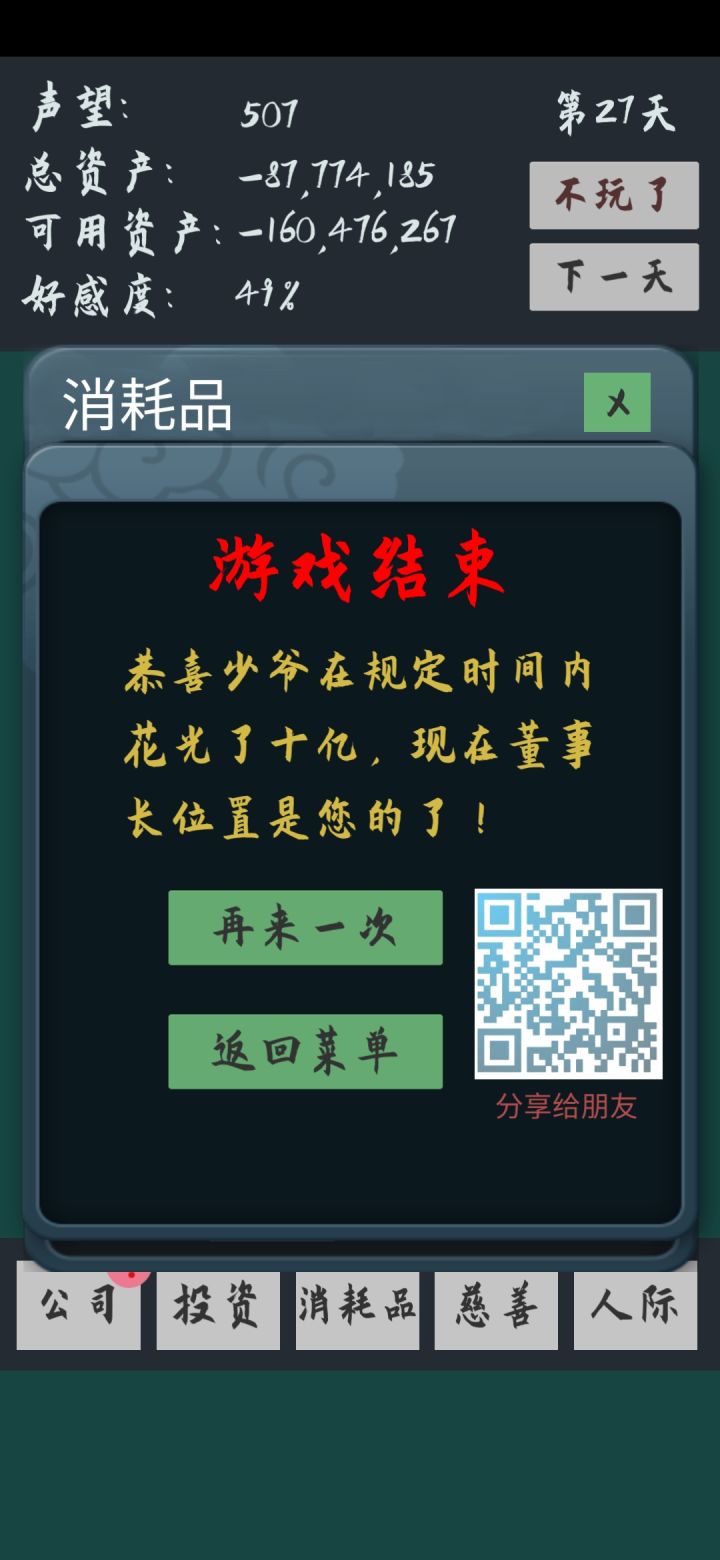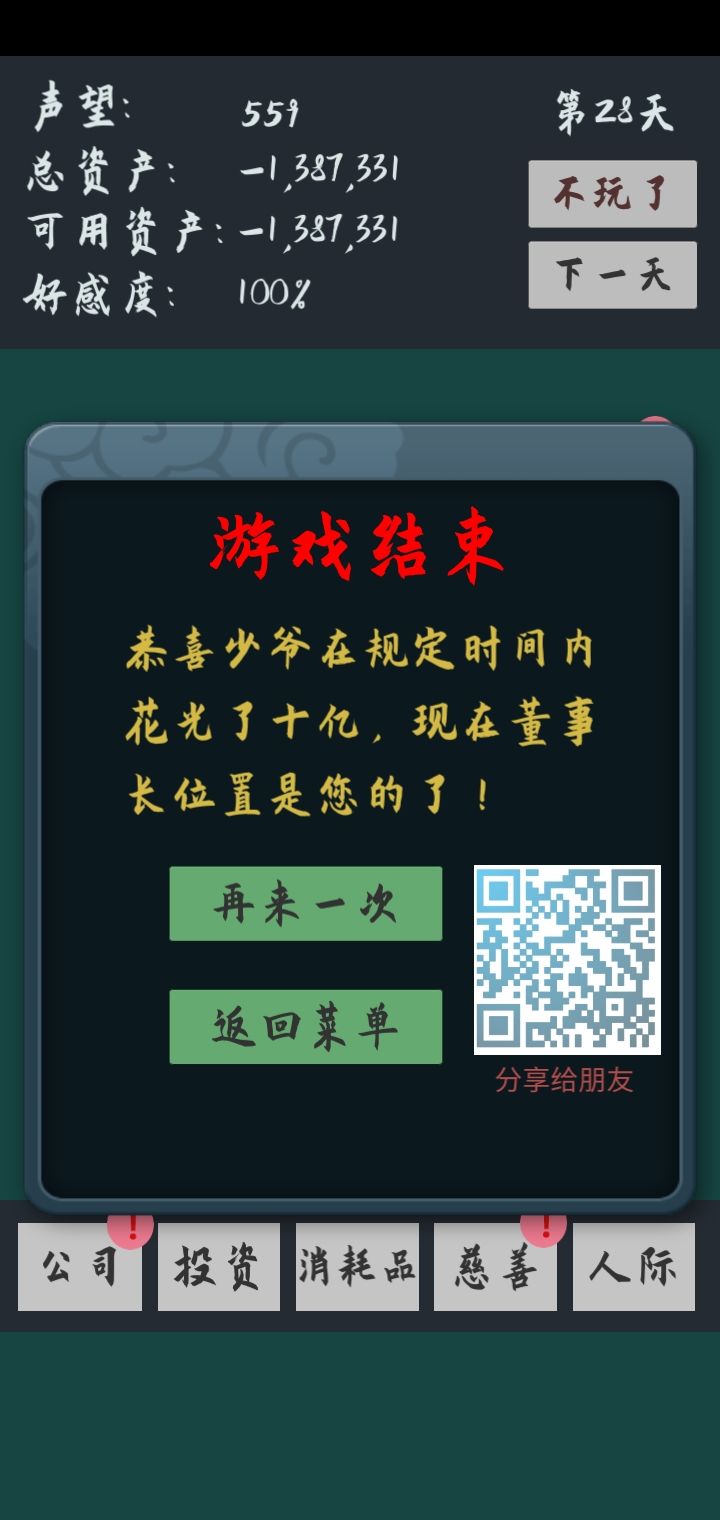 第一第二天如果慈善没有刷到20声望不要去酒会,声望不加反减。然后公司转盘完全就是靠蒙的,基本上没法去看。前期尽快搞到一个老婆,然后老婆可以经常换,因为你离婚后再去加好感失败的几率会变大,是个花钱的方法。(老婆这里说一下:颜值和人品越低的老婆离婚降的声望越高,呈规律递减最小1。然后颜值越低的你越容易加好感)酒会里前期遇到投资果断去选,只要你连续不断投资半个月左右就会有诈骗,诈骗扣的钱比你投资赚的要多多了。老婆也是一样,你只要连续不断的约会就会遇到仙人跳和陪酒,也扣钱多。能卖的投资这边建议过一天就卖掉,不管涨跌,因为它们基本上最后都会疯涨的。中间那个五千万看情况要不要,如果当时你钱少于一半(就是500.000.000)其实你可以不要。