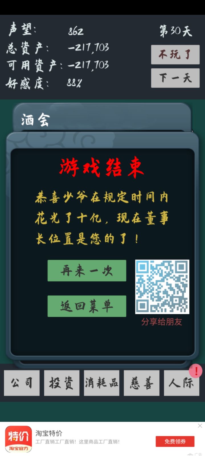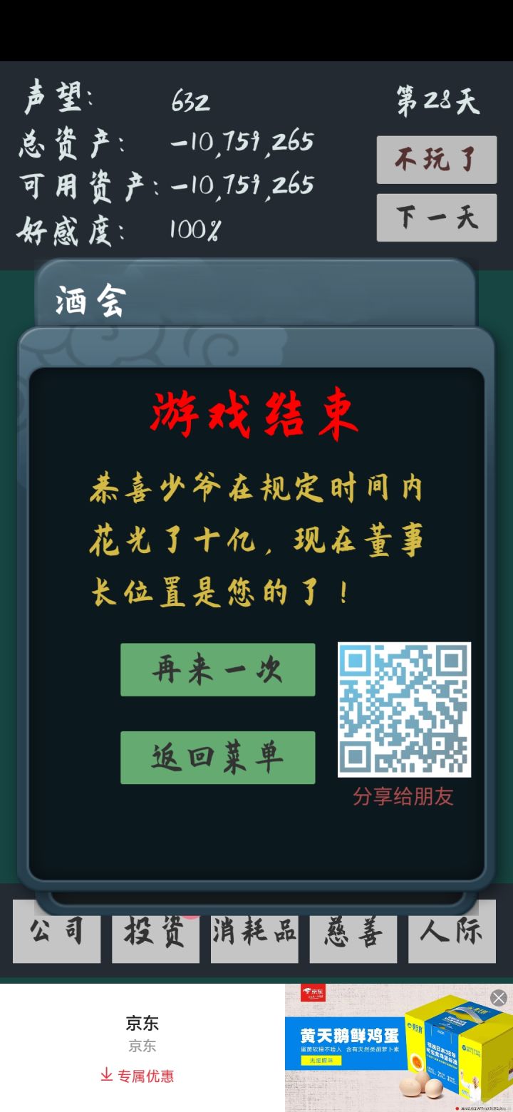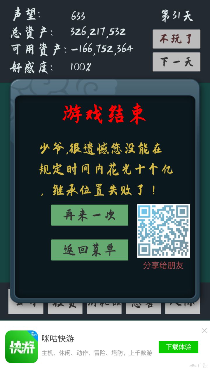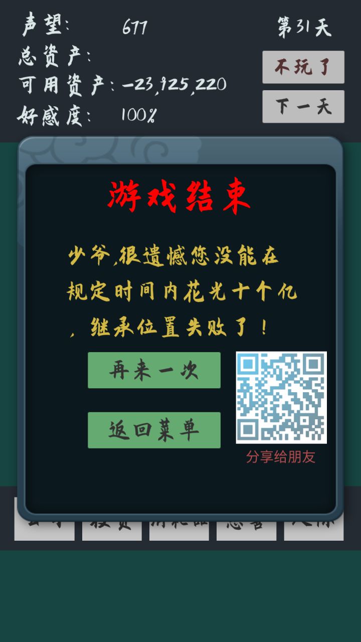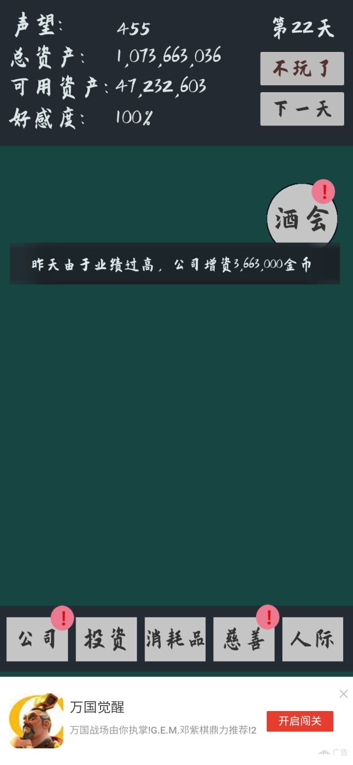 算法有问题,成功了结果告诉我失败,第21天就达成了目标,也没有提前结束或者跳过功能,没了钱很多投资不能做了,很无聊的点点点,终于到最后一天了,结果给我来这出,对这个游戏也太不上心了吧,这么大的bug也不管管