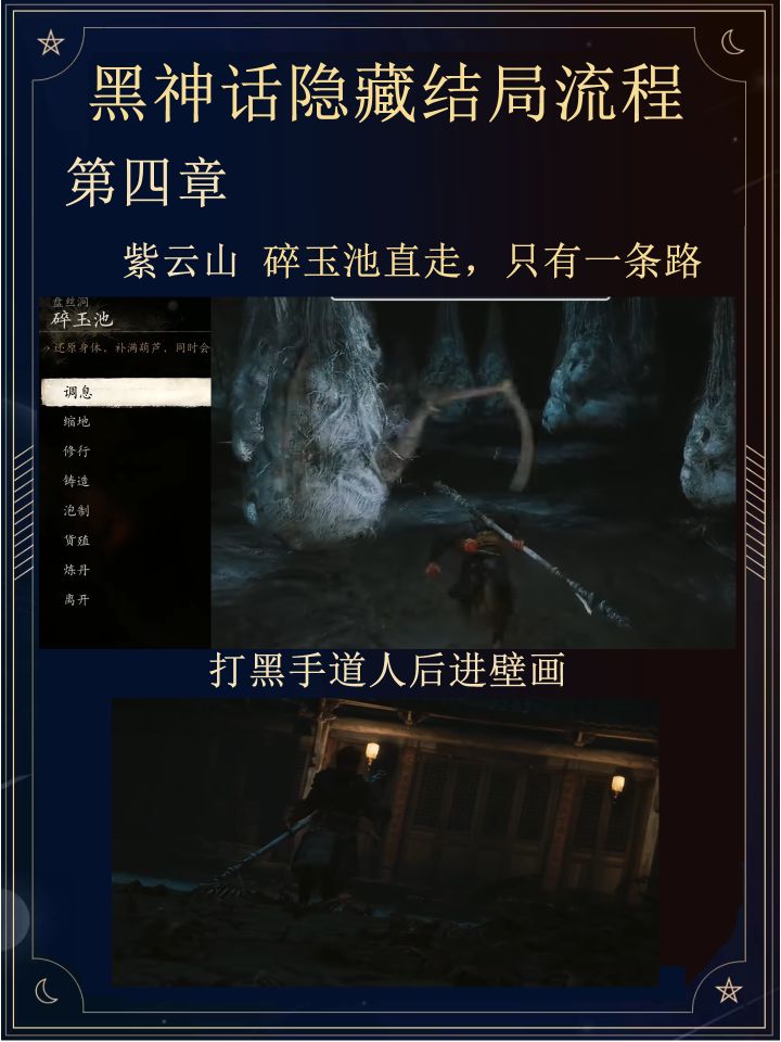 最简单的二结局流程:第一章 旧观音禅院 敲三次钟第二章 古国 路边找猪妖接任务第四章 紫云山 打黑手道人后进壁画,有视频第五章 碧水洞 找牛妖接任务打五行战车 有视频第六章 拿完所有装备 在花果山顶石头前存档前往第三章 帮助两次斗笠人(需要会安身法),一个悬崖下面就是瓜田任务,给你禁字法。小和尚会告诉你浮屠塔有一位故人在等你,这时候再去浮屠塔他会送你去二郎神那里。(好像对壁画没要求,我