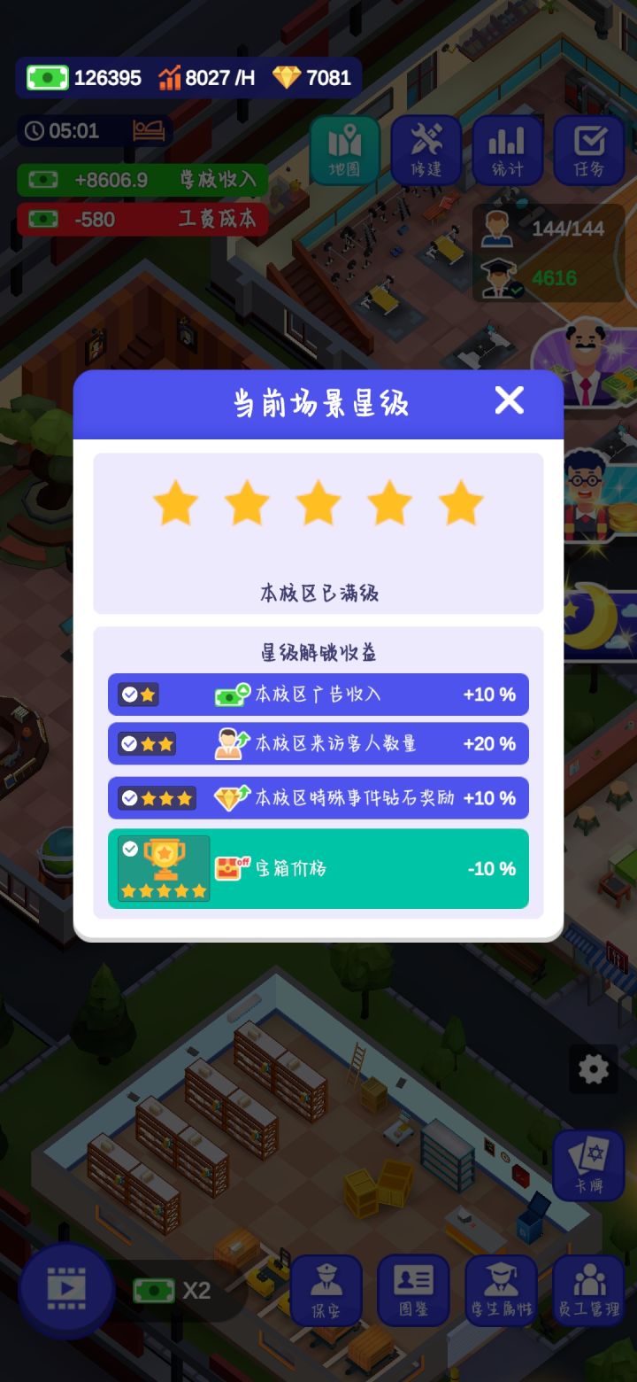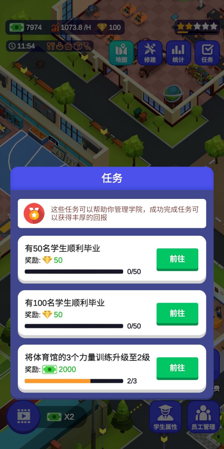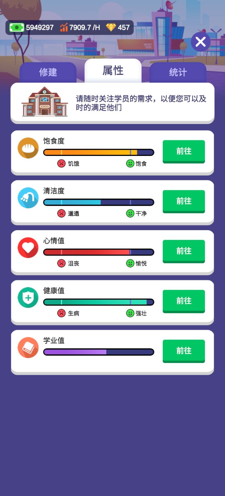 毕业!但是第二个和第三个校区的清洁度永远不会满,是bug,因为一校区教学楼有卫生间可以加很多清洁度,二三校区都没有,还多了消耗贼多清洁度的健身房,而且学生晚上12点一回来就直接上床睡觉,连澡都不洗,清洁度就永远救不回来了😪