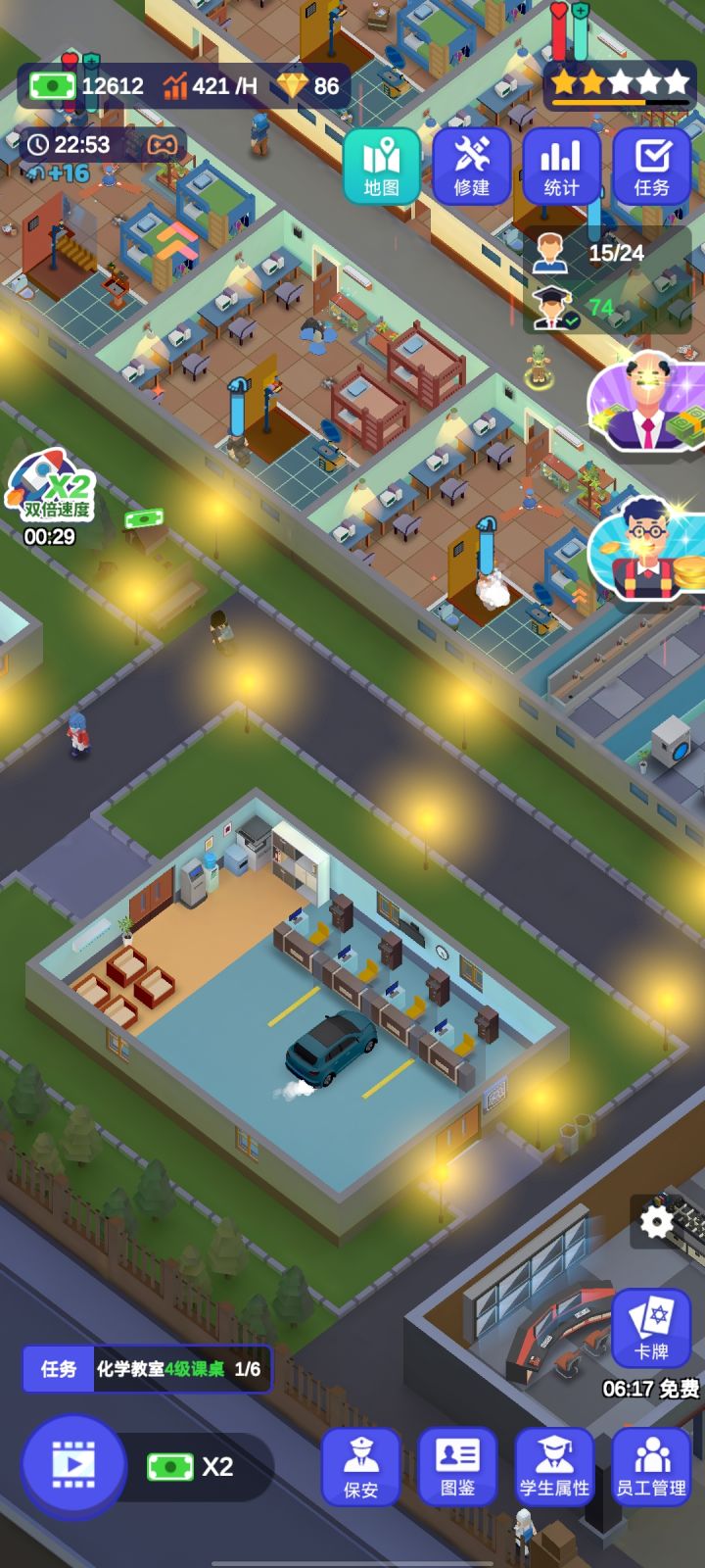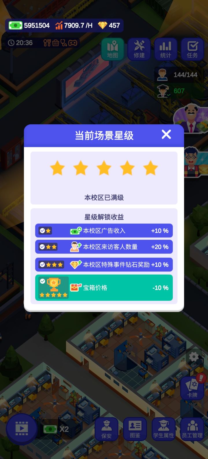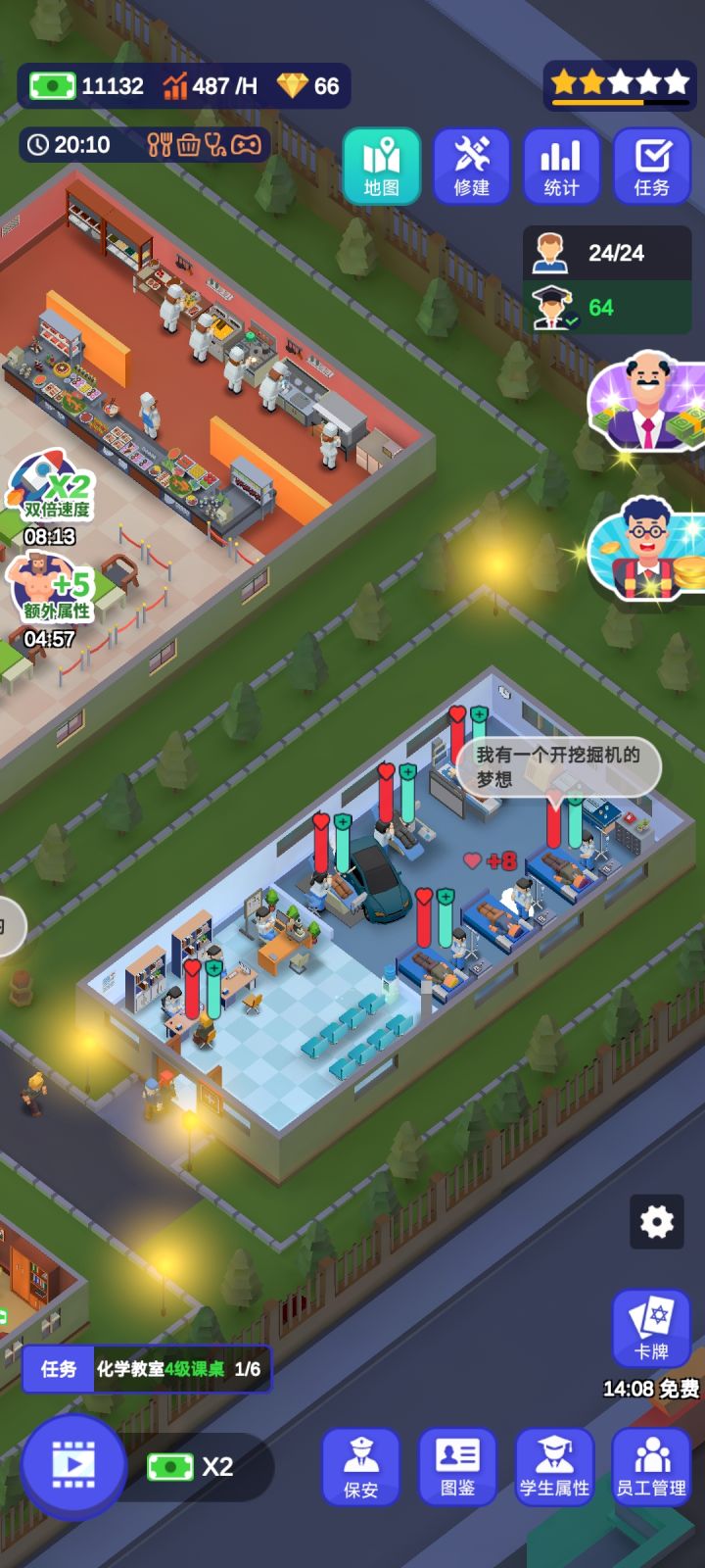 毕业!但是第二个和第三个校区的清洁度永远不会满,是bug,因为一校区教学楼有卫生间可以加很多清洁度,二三校区都没有,还多了消耗贼多清洁度的健身房,而且学生晚上12点一回来就直接上床睡觉,连澡都不洗,清洁度就永远救不回来了😪