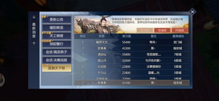 第五赛区6月20日城战记录如下:城战地点:虎丘剑池交战双方:致青春联盟与伊人笑联盟展开激烈城战城战结果:致青春同盟攻城成功,一举拿下虎丘剑池城池,伊人笑同盟失守城池,同盟将退回太池宫城池。目前伊人笑占领太池宫,拾贰楼联盟占领龙门城,致青春联盟占领虎丘,龙泉,临安,骚男天空占领明目谷,还剩最后两场城战,四个联盟势均力敌,战场瞬息万变,不到最后,都不知道结果如何。谁能笑傲临安、夺得霸业魁首,仍
