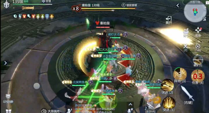 <秦始皇>1阶段(普通模式可在此阶段直接将BOSS打至10%血锁血,直接进入4阶段)·BOSS血量90%-70%全员小型AOE全员分摊伤害;受到攻击的玩家周身环绕红色剑标(包括被点名的玩家),剑标消失时会于脚下出现范围地板伤害,玩家散开,待剑标消失回到<秦始皇>处继续输出即可。·BOSS血量70%-60%随机小型地板伤害普通双/竞速四点名(四个点名同时受到伤害)被点名的人(普通2/竞