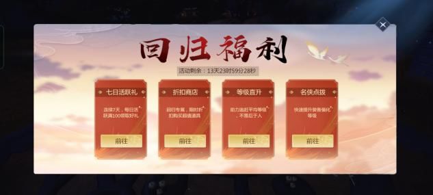 亲爱的老朋友们,很想回归剑侠继续闯荡江湖,又担心等级追不上,跟大家会有很大的差距,不用怕,接下来带你走后门一步追上同区玩家请看图文详情ps:(回归奖励中的装备等级和角色等级直升级数根据当前区服等级上限判定,不是固定等级直升哦!) 第一步进入游戏找到界面屏幕上方的回归活动,点开就可以“走后门啦”!专属回归福利活动分为四大类,第一类:七天活跃好礼,奖励如图所示非常丰厚,可以过一把十连抽的手瘾了。