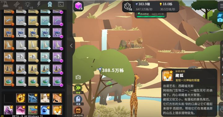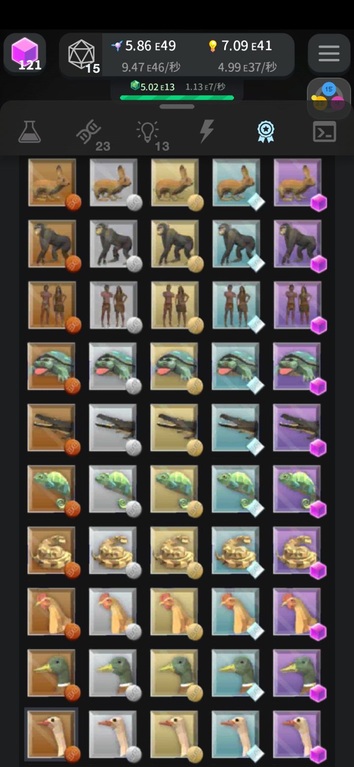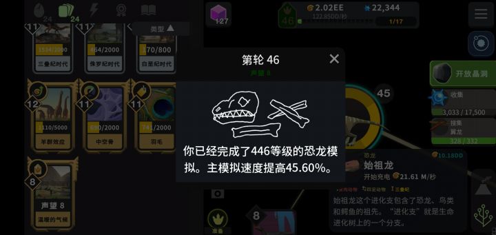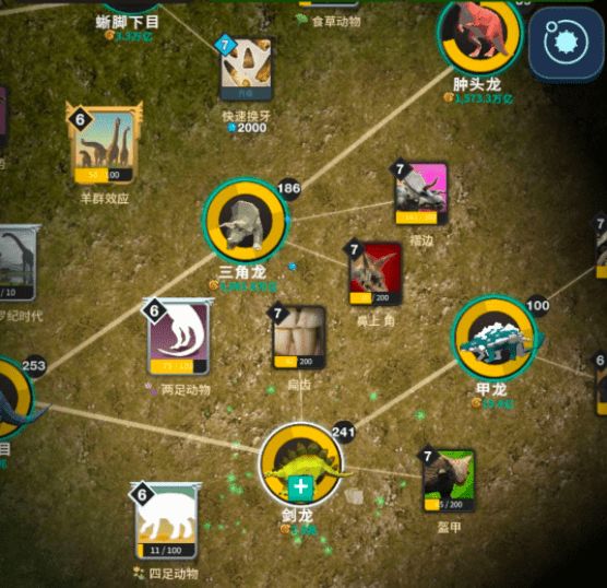 一旦扁虫解锁,一块神秘的岩石就会出现在主树上。反复点击岩石会摧毁它并解锁中生代山谷:一个新的,独立的模拟,在其中可以找到一个单独的科技树。推进第二次模拟可以提高主模拟的速度,并最终解锁其他发电机。中生代山谷从一个恐龙节点开始,随着你等级的提升,更多的物种会解锁。单击屏幕将以每次单击一个的速度生成化石点,但通过单击树中每个恐龙节点顶部的箭头按钮来"充电"节点,可以更快地获得化石点。点击恐龙本身可以让