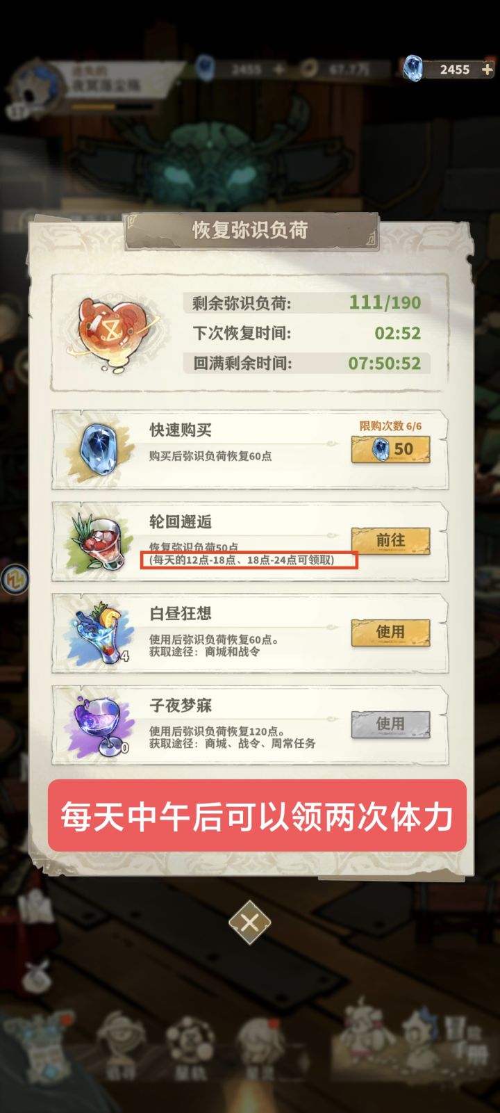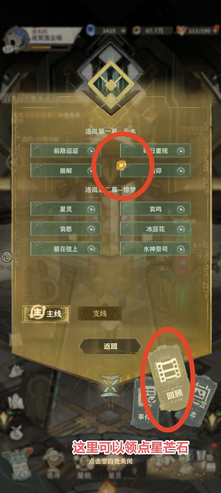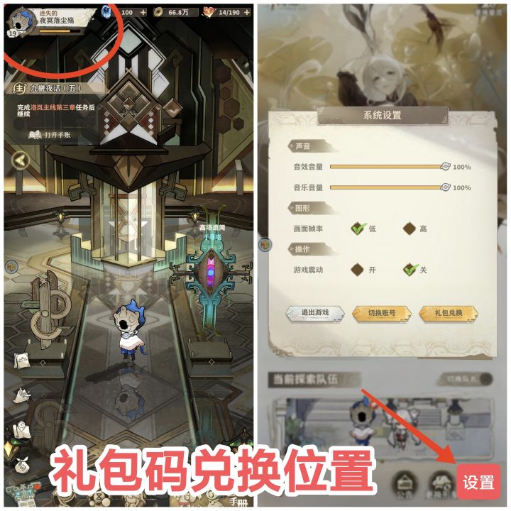 图一每日日常两次体力的领取位置。时间一到首页右上角体力就会有小红点提示。一天可以领100体力!图二任务栏那里手账进去点回顾可以领一些遗漏的星芒石!图三兑换码位置在左上角游戏名称进去设置(目前我拿到的唯一兑换码就是加群找管理送的一抽)图四有时候做任务点击右上角跳过可能会发现任务并没有完成,这时候就需要你慢慢点屏幕看它自己完成!图五钓鱼务必把圈缩在绿色圈上有30%加成,然后进去后让光