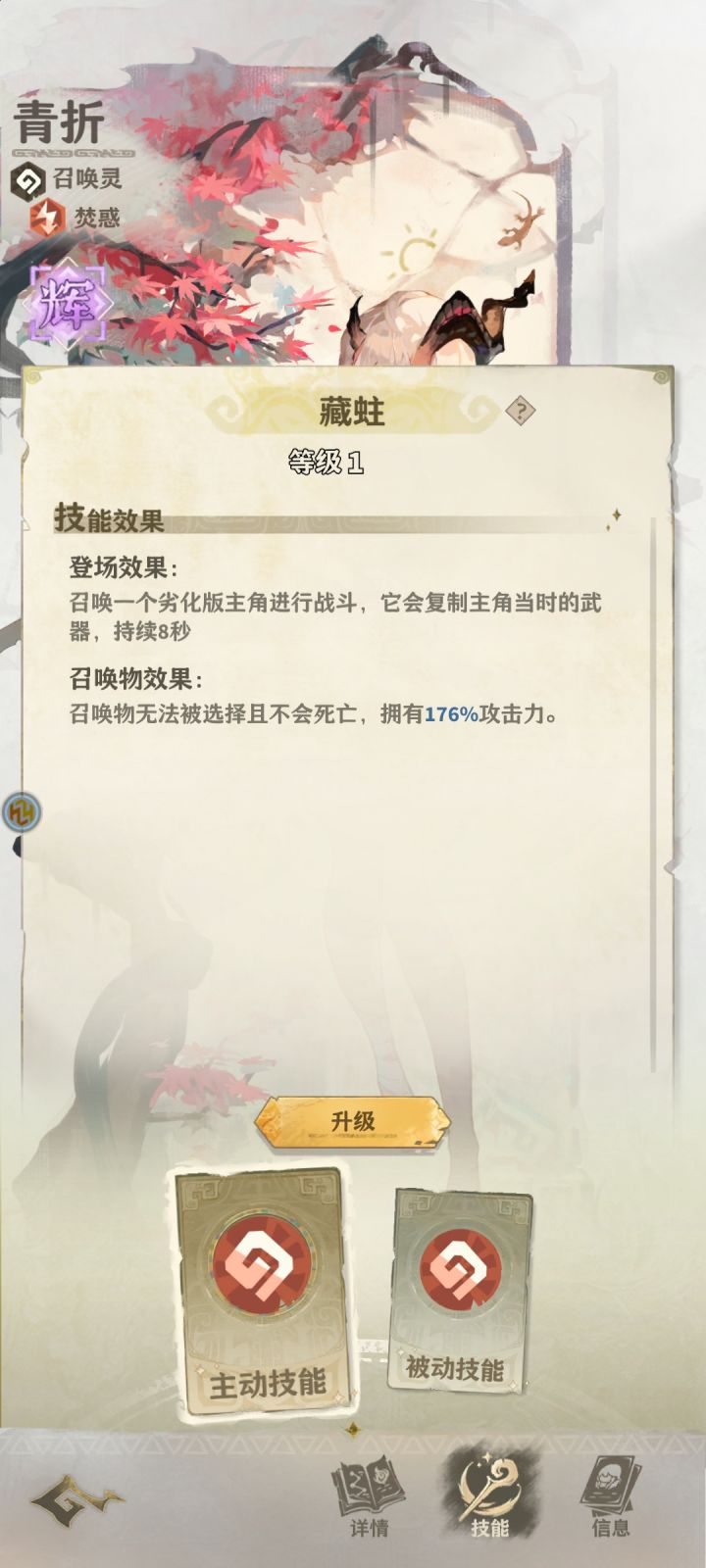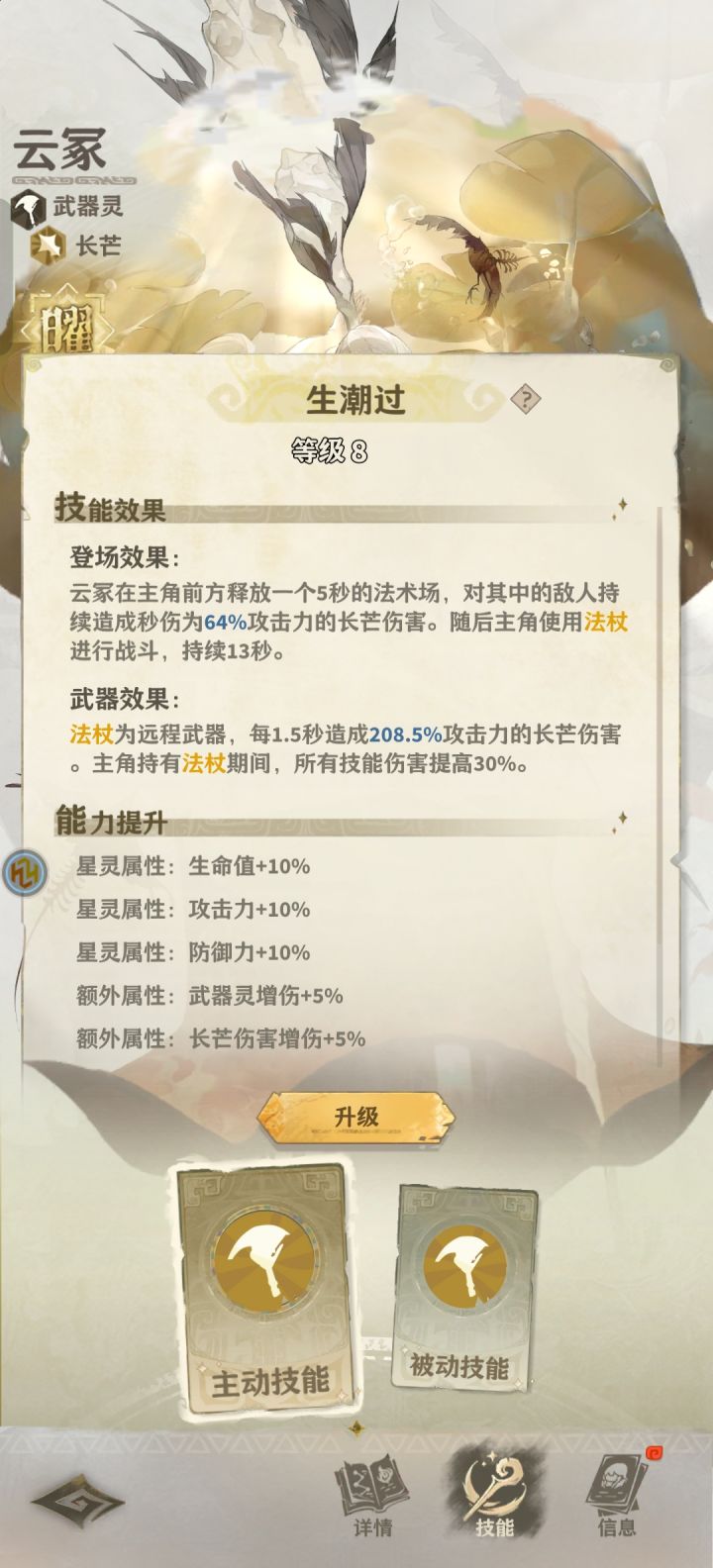 一、角色基础信息 1、星灵:贞歧 2、专精:法术灵 3、属性:虞皇 4、级别:曜级 5、基础数值:A级生命值7080、A级攻击力67、A级防御力65、S级暴击值37、S级灵感速度31 6、主动技能《低语》:法术效果是释放一道月光,对随机敌方单位造成650%攻击力的虞皇伤害。战斗中每释放一道月光都会使后续月光伤害提高30%,叠加上限6次。 7、被动技能《牵识》:敌方单位死亡时,贞歧