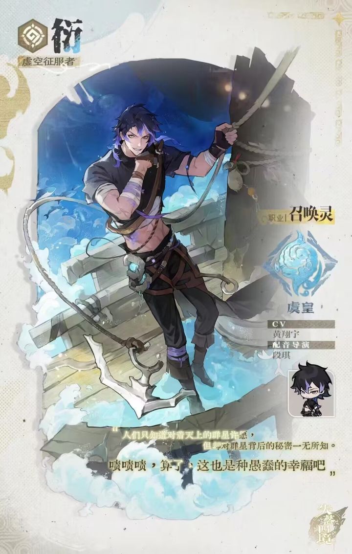 亲爱的小伙伴们大家早上中午晚上好啊,今天给大家带来一个特别强力的角色的相关攻略,那就是召唤灵的强力辅助角色衍,我愿称他为召唤灵的皇,以下内容为个人见解,如有错误请大家及时纠错,欢迎大家在评论区热情讨论。角色基本属性 ·星灵:虚空征服者·衍·职业:召唤灵 ·属性:虞皇·级别:曜级一个放荡不羁、衣着随意、探索虚空背后秘密的云海航行者,看着就有够洒脱。,像是个不拘一格的智者,和他的技能很贴合