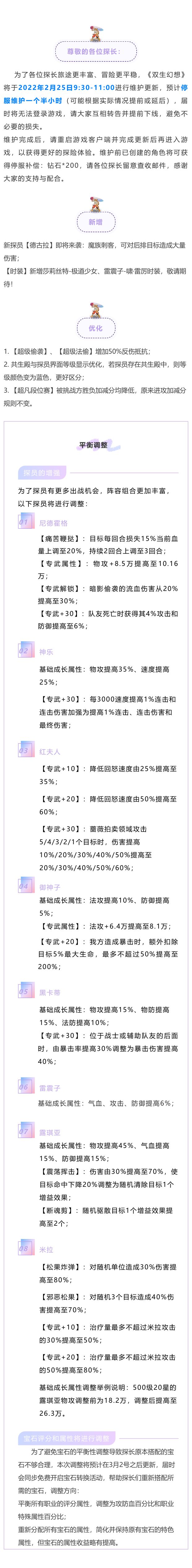 尊敬的各位探长:为了各位探长旅途更丰富、冒险更平稳,《双生幻想》将于2022年1月21日9:30-11:00进行维护更新,预计停服维护一个半小时(可能根据实际情况提前或延后),届时将无法登录游戏,请大家互相转告并提前下线,避免不必要的损失。维护完成后,请重启游戏客户端并完成更新后再进入游戏,以获得更好的探险体验。维护前已创建的角色将可获得停服补偿:钻石*200,请各位探长留意查收邮件,感谢大家的