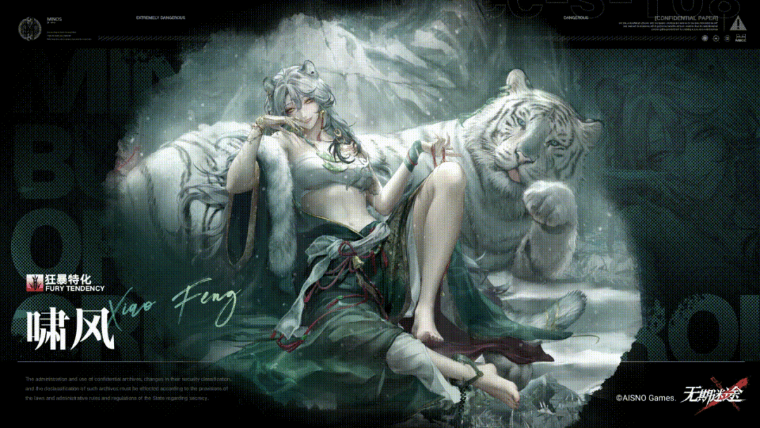 ■MBCC-S-108 啸风■狂暴特化 Fury Tendency「你们人可真麻烦,要我说就是爱作妖,衣裳首饰一堆花活。但这肉烤得确实挺香,酒也不赖,嘿嘿,咱都尝尝……」*条目I:对象是居住在东洲白寅山上的强大禁闭者,被山下居民奉为“白虎山君”。平日常隐居山林与野兽作伴,但偶尔也会下山混进人类的市集,吃菜喝酒听戏。*条目II:对象在朔雪山庄与局长结缘后,对局长和狄斯产生兴趣,带着白虎随商队