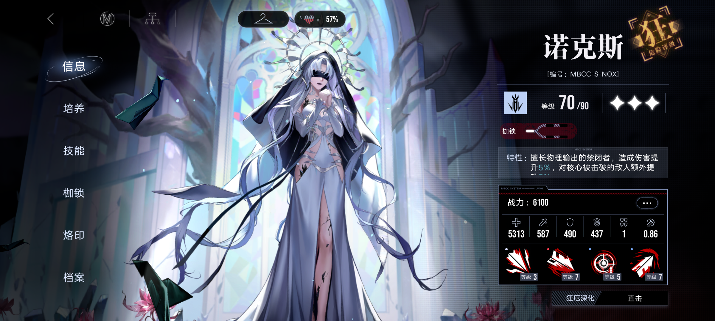 nox(或者大哥)要65以上,中间要替得莫莉扛一段,太低扛不住,烙印带普攻三件套,补伤害,不推荐能量套,我自己试了伤害不太够,就算打的过去也在5min外了