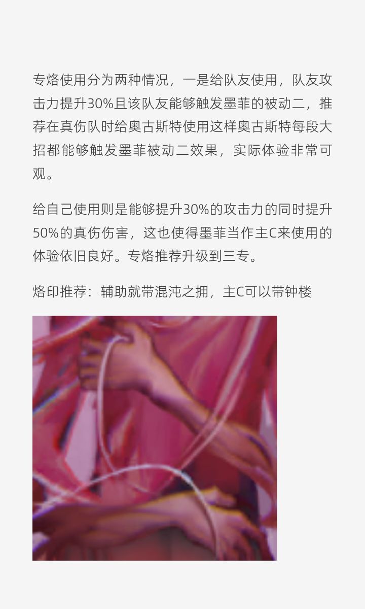 1.一图流总结:真伤拐,玩残锋队可抽,可以代替ll或者重构娜恰。零锁就是完全体,不建议抽任何枷锁。 特性:每次普攻获得一枚霉运印记,一层持续128秒,每增加一层,持续时间减半,叠满8层之后,持续时间只有一秒。(是一个持续接敌的角色)必杀:全部伤害为真伤且视为普攻,1-4层定身,4-6层范围减速,7-8层有火球打伤害。标记很容易叠满,只需要在8层释放必杀即可。被动一:必杀后有40%普攻易伤