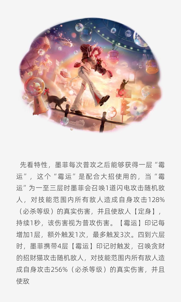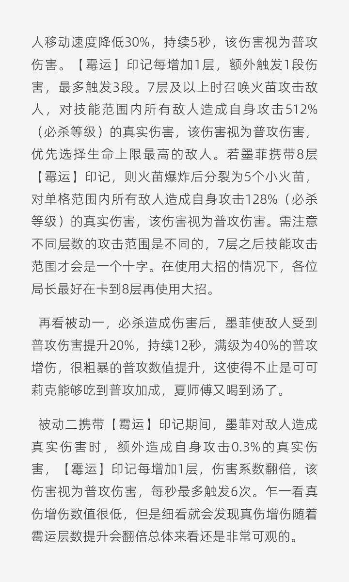 总结普攻拐,攻击拐,和奥古斯特相性一般,和可可相性很好,但是可可莉克目前太弱了,主要还是作为凯瑟琳的辅助使用长线卡,必杀出伤太慢,维持霉运层数也比较麻烦枷锁没有拐力提升,一般来说作为辅助0锁即可基础情况技能1、【霉运】是墨菲的核心效果,每有一层【霉运】持续时间减半,第八层霉运仅持续1秒,也就没有额外攻速拐和不走a的情况下墨菲做不到8层【霉运】永续,会掉层2、【霉运】仅普攻行为可以叠加