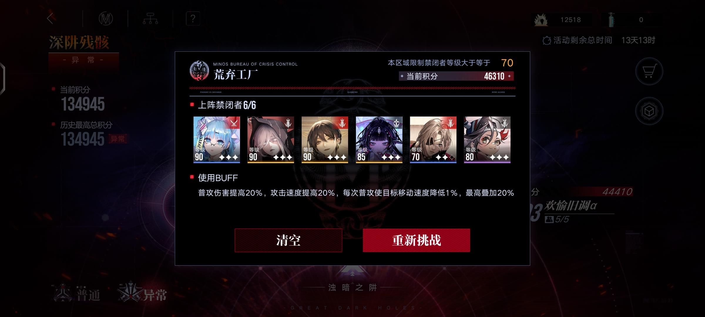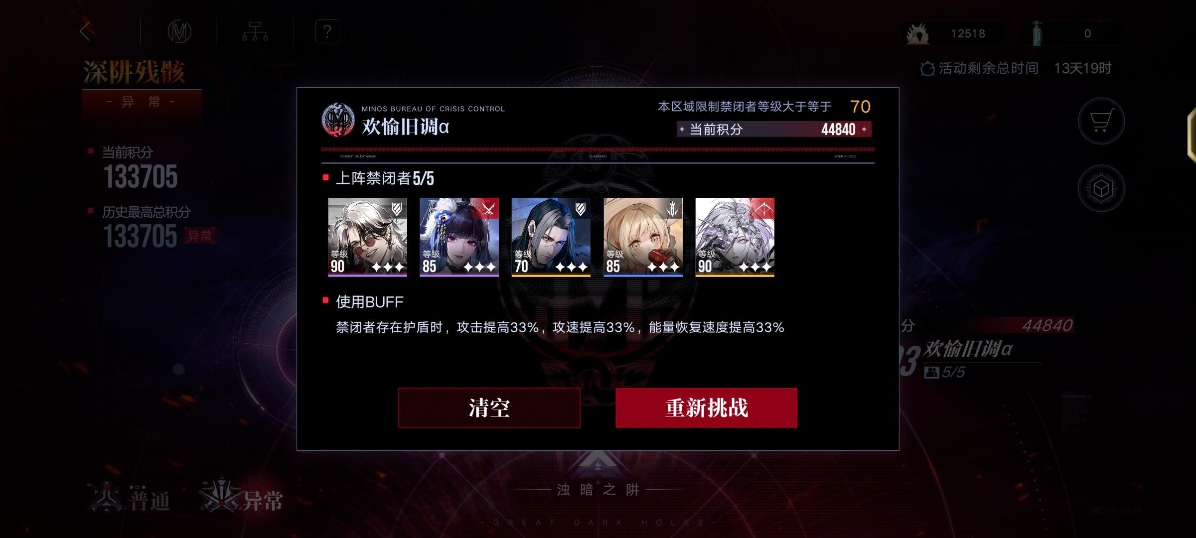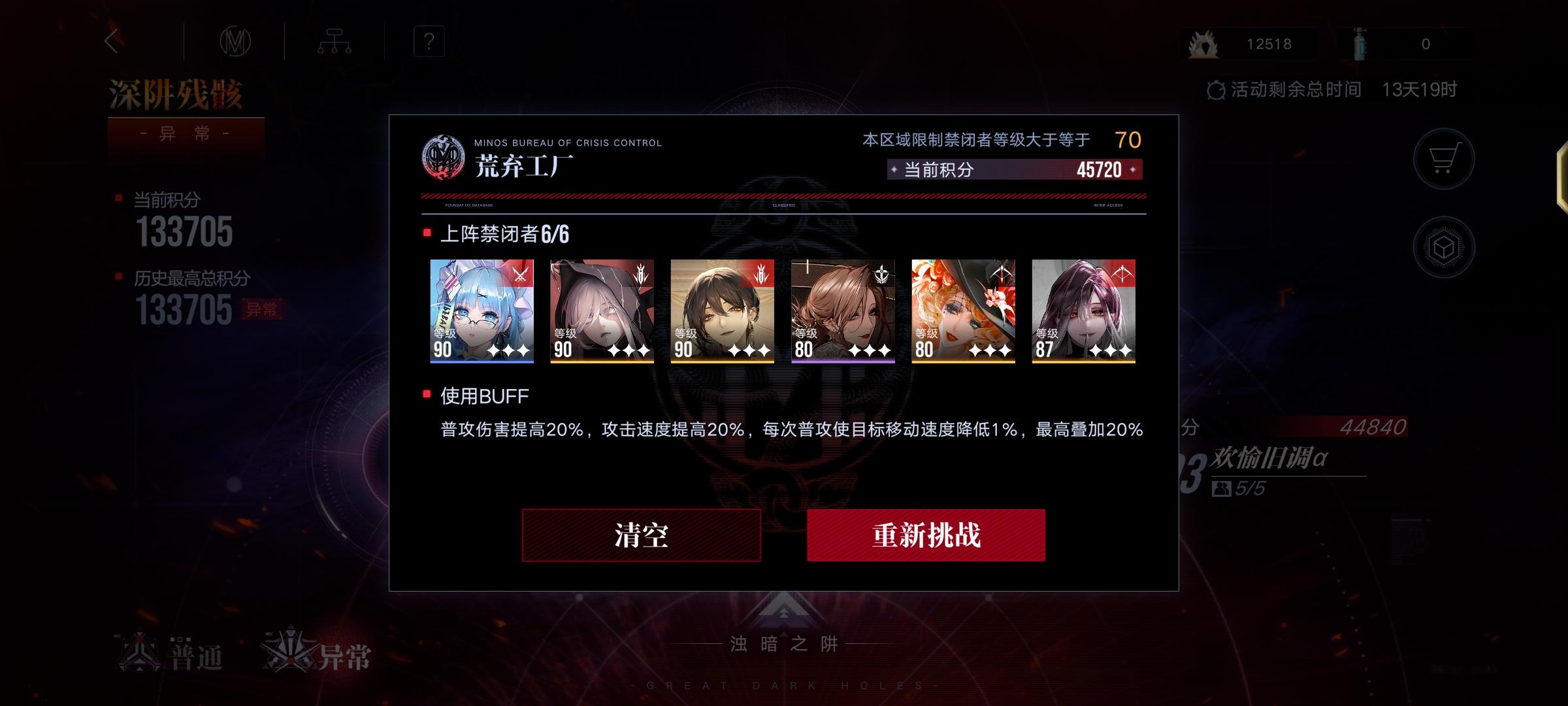 结束了,【入门级】伤害不够。 ------- buff: +10%攻击,-20%血 队伍: lv90诺克斯3锁1专,9000,调律零+逆位之裁 lv90德雷雅3锁3专,0000,混沌之拥 lv90李维5锁3专,7999,梦魇+希望 lv90堇5锁3专,9799,调律零+希望+回廊 lv90胡椒5锁3专,9999,魂之裂痕+回廊 lv85女仆5锁3专,9099,心之殇+回廊