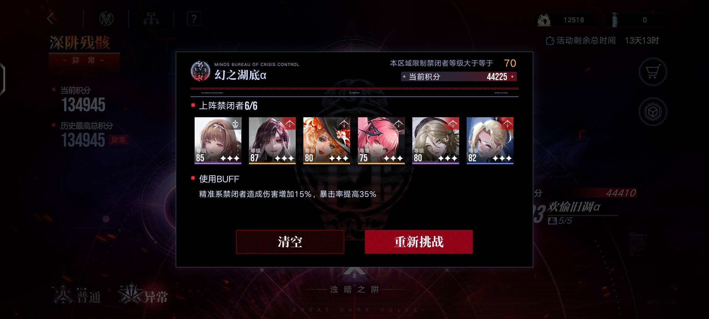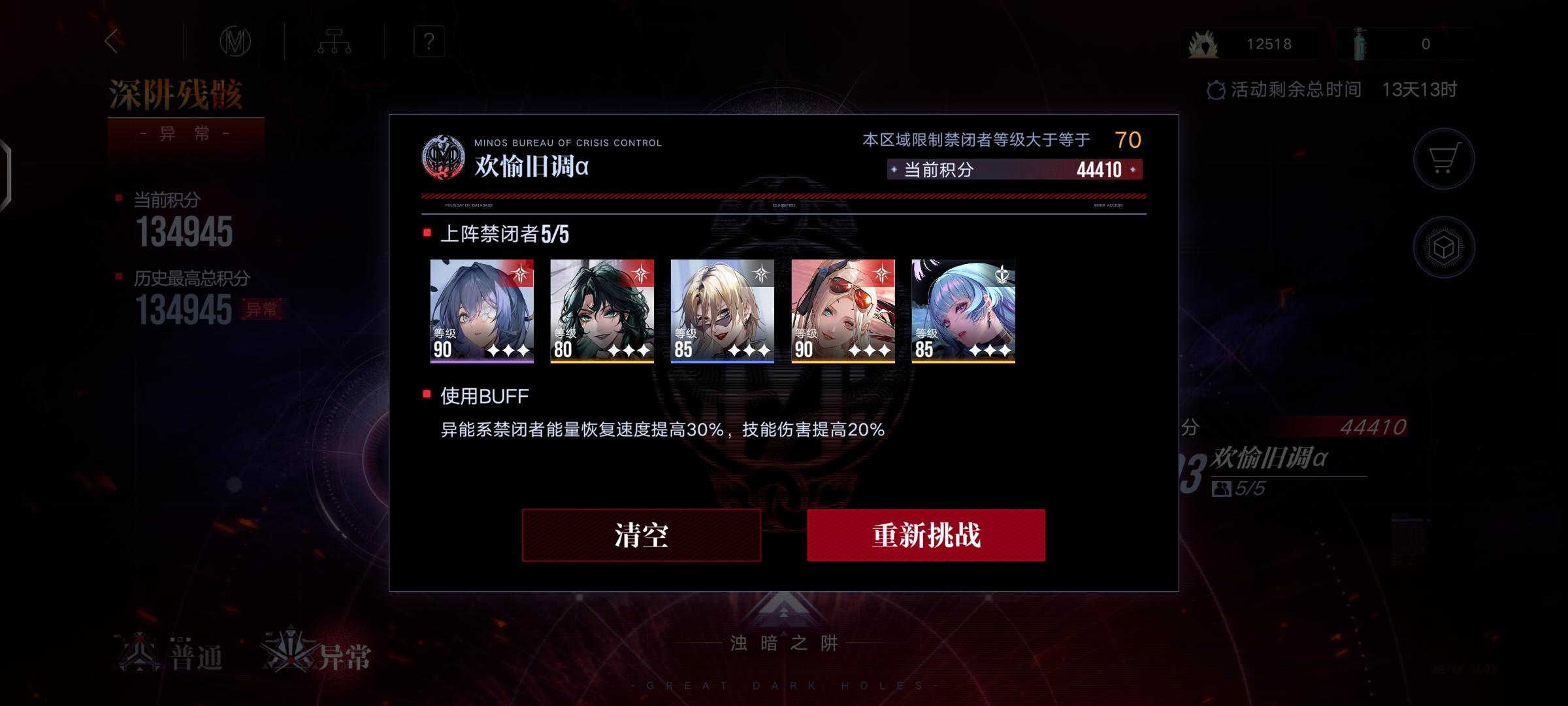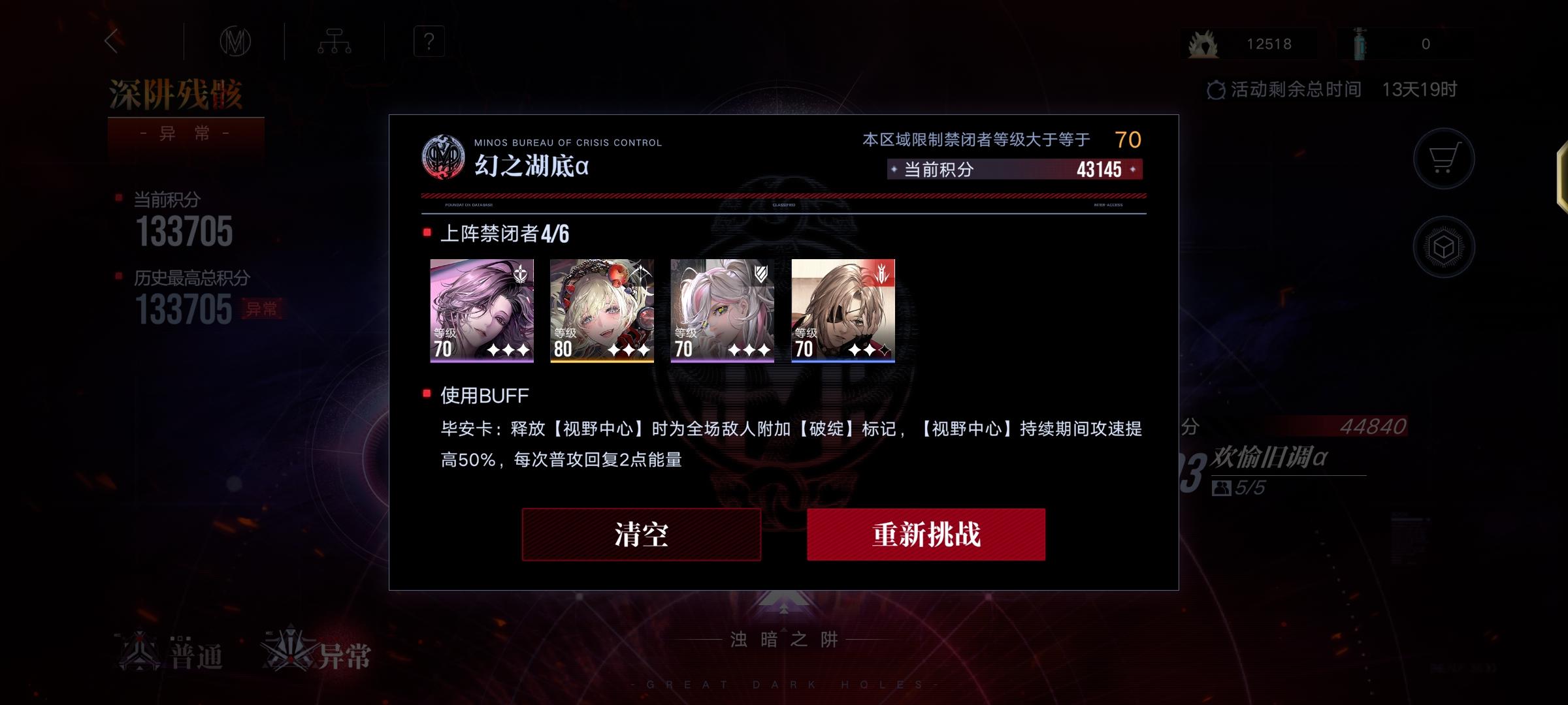 结束了,【入门级】伤害不够。 ------- buff: +10%攻击,-20%血 队伍: lv90诺克斯3锁1专,9000,调律零+逆位之裁 lv90德雷雅3锁3专,0000,混沌之拥 lv90李维5锁3专,7999,梦魇+希望 lv90堇5锁3专,9799,调律零+希望+回廊 lv90胡椒5锁3专,9999,魂之裂痕+回廊 lv85女仆5锁3专,9099,心之殇+回廊